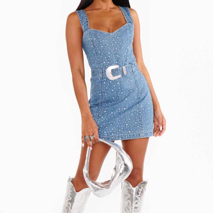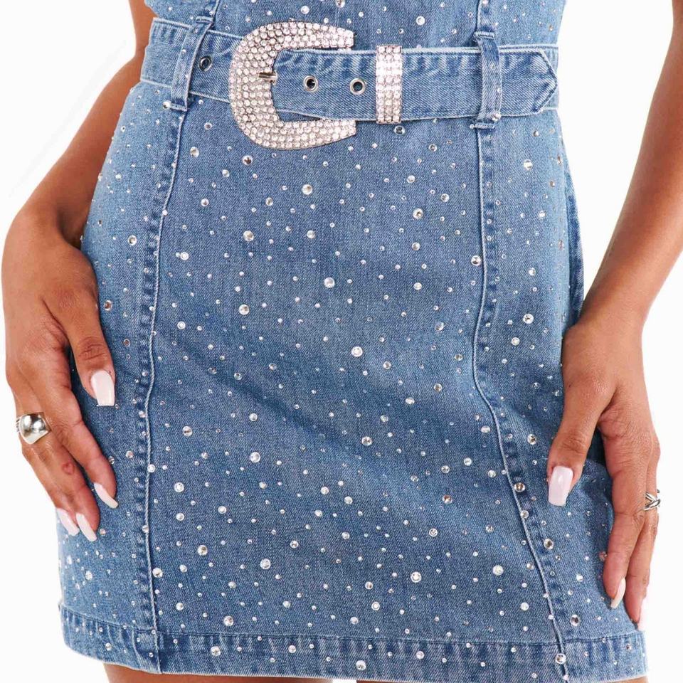 ชุดเดรสยีนส์คุณภาพสูงสำหรับผู้หญิง ออกแบบตามสั่งจากโรงงาน แต่งคริสตัลเก๋ไก๋ แฟชั่นทันสมัย ชุดเดรสยีนส์สั้นแบบเซ็กซี่แต่เรียบร้อย
