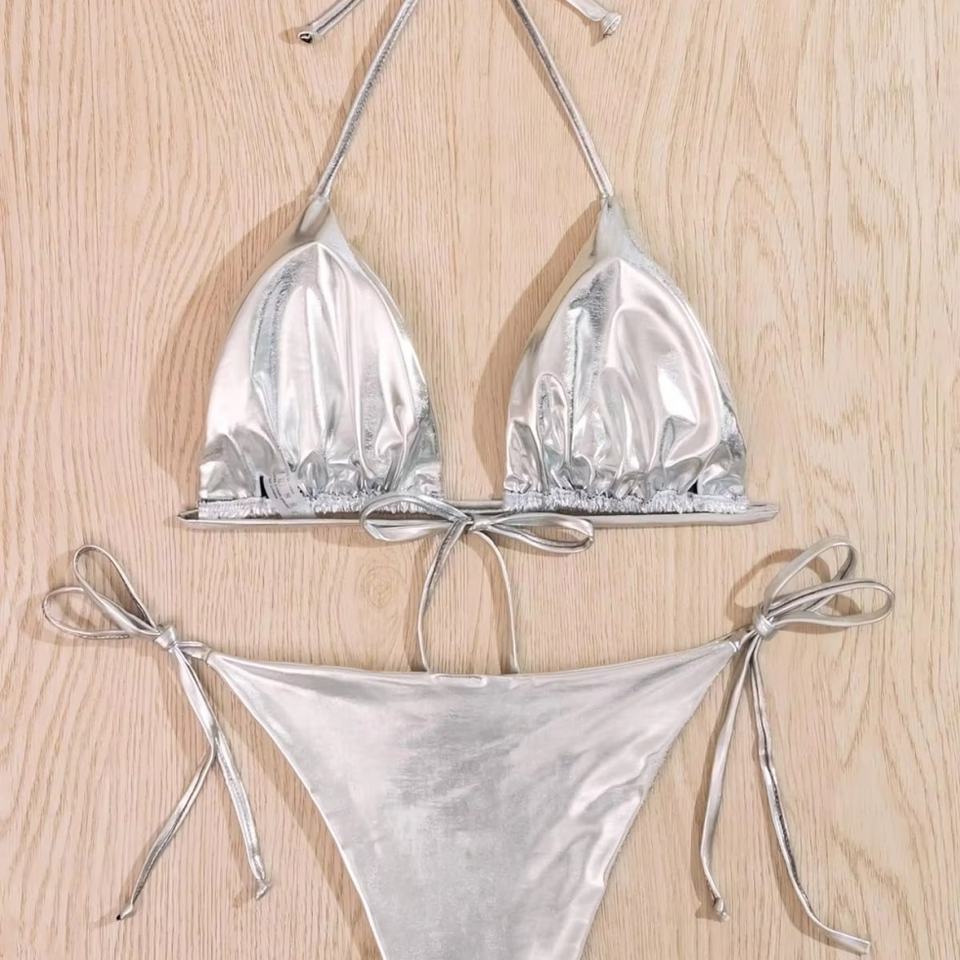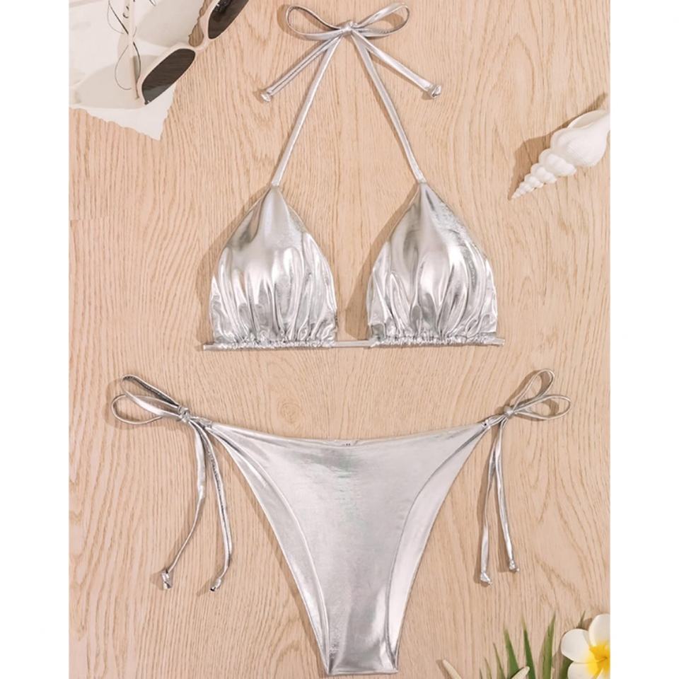 ชุดว่ายน้ำบิกินี่หรูหราสีทองเมทัลลิกแบบสั่งทำพร้อมโลโก้ผู้ผลิต ชุดว่ายน้ำผู้หญิงแบบสองชิ้น