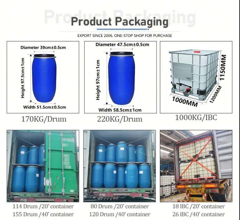 แพ็กเกจ:170 กก./ถัง, 210 กก./ถัง, ถัง IBC, ถุง FLEXI