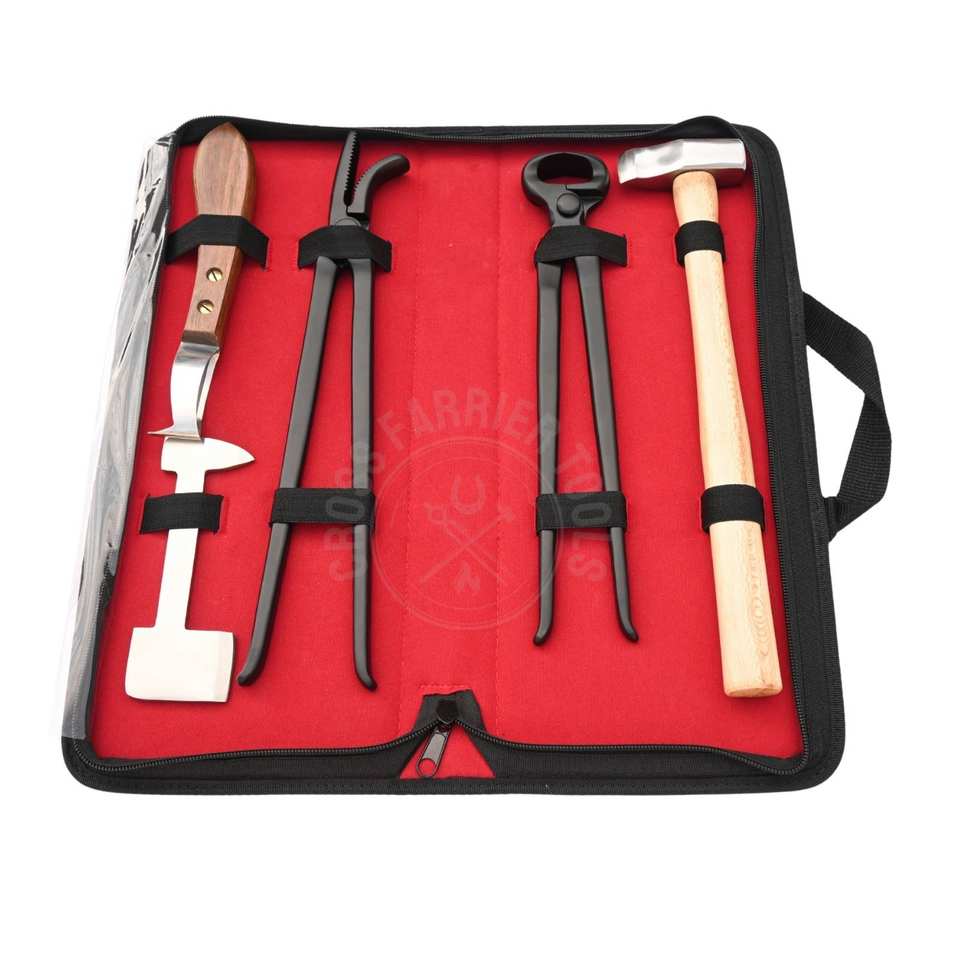 ชุดเครื่องมือช่างตัดแต่งกีบม้า พร้อมค้อนตัดแต่งกีบม้า ที่ขัดกีบม้า มีดตัดแต่งกีบม้า คีมตัดแต่งกีบม้าแบบถอดได้ และที่หนีบกีบม้าแบบจระเข้