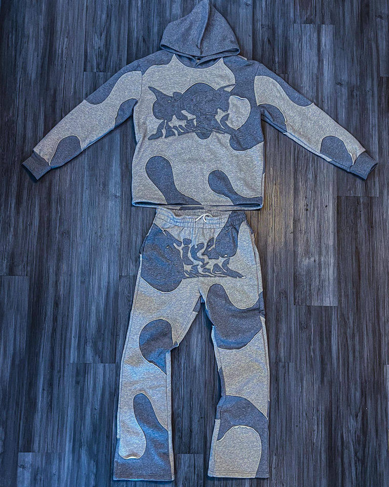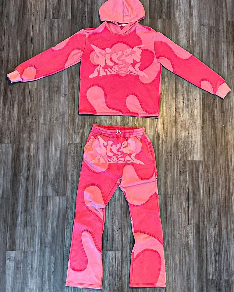 ชุดเซ็ตแทรคสูท 2 ชิ้น เสื้อฮู้ดดี้ผ้าฟลีซคอตตอน 465GSM ตัดเย็บแบบแพทช์เวิร์คตามสั่งจากผู้ผลิต พร้อมกางเกงทรงบานพิมพ์ลายพัฟฟ์สำหรับผู้ชาย