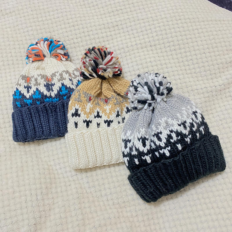 หมวกไหมพรมปอมปอมปอมแบบถักสำหรับฤดูหนาวหมวกฤดูหนาวผ้าแจ็คการ์ดให้ความอบอุ่นแบบทันสมัยใหม่