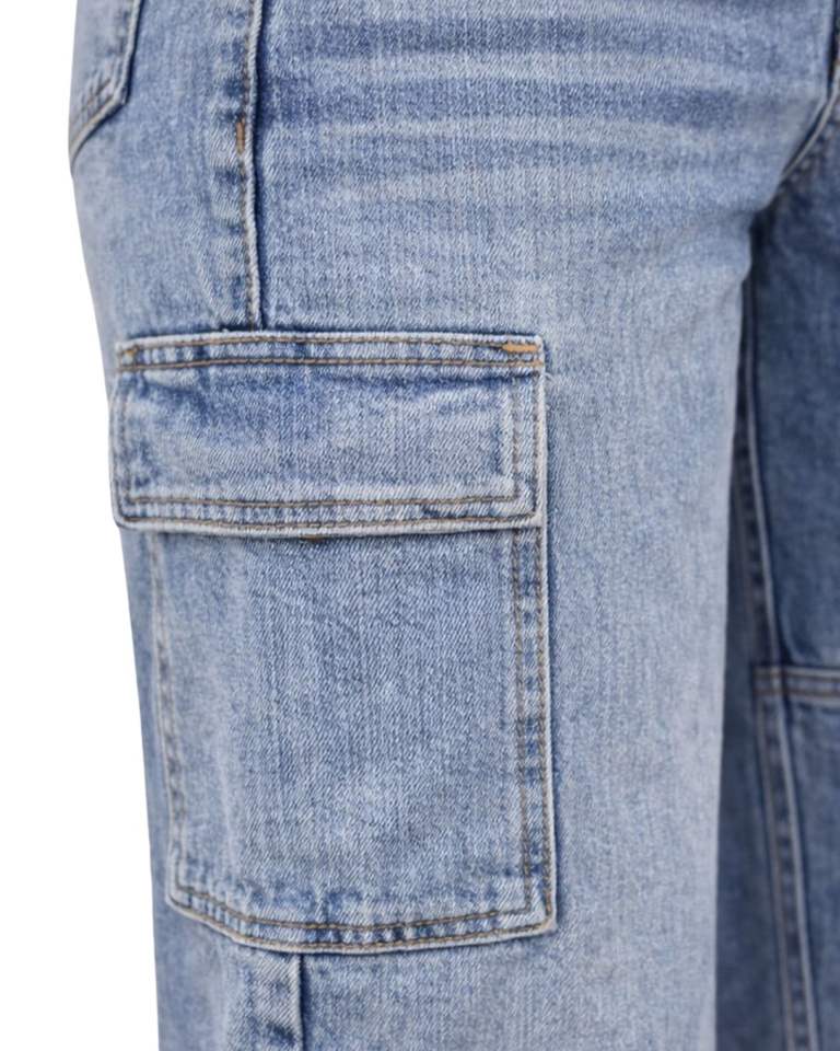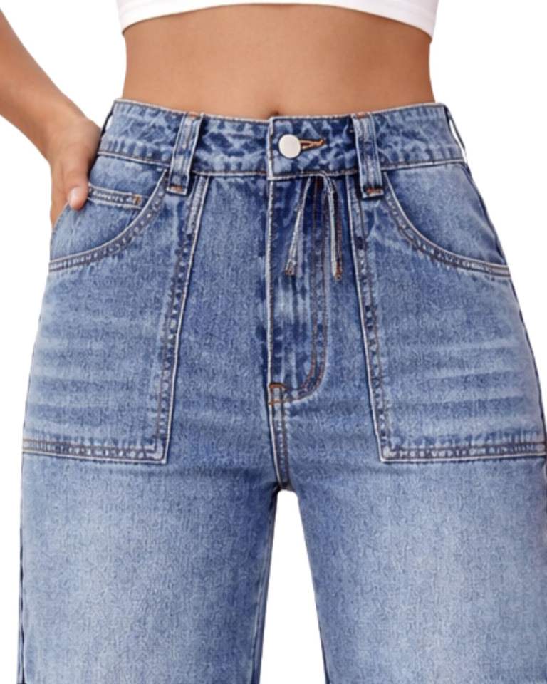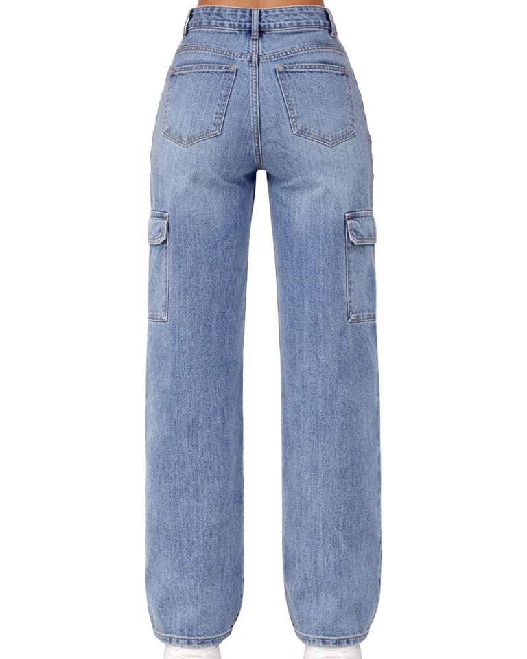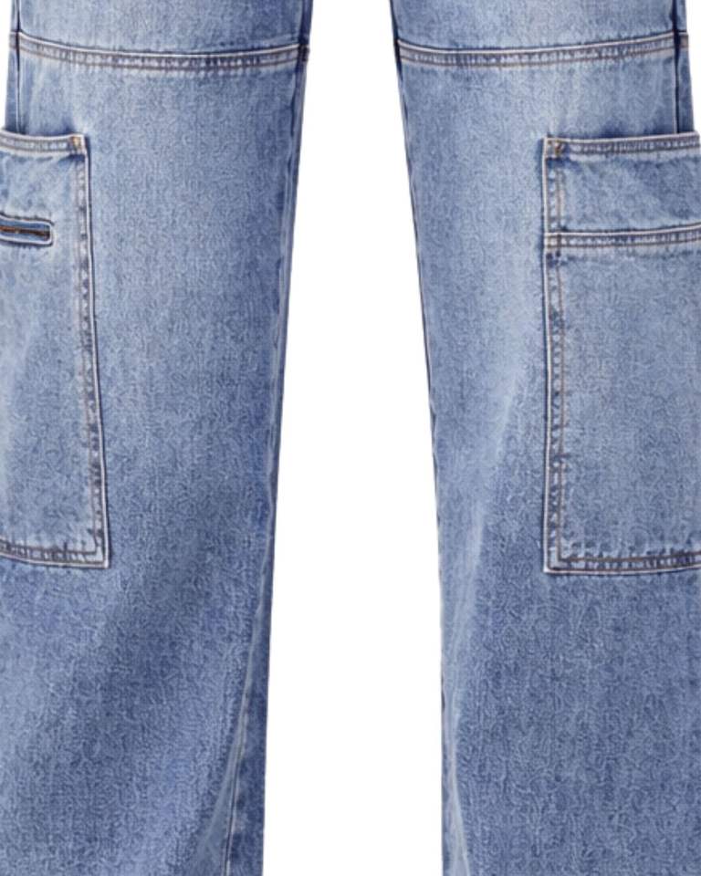 กางเกงยีนส์เดนิมทรงคาร์โก้สีฟ้าอ่อนเอวสูงทรงขากว้างมีกระเป๋าปะ สไตล์สตรีทลำลองสำหรับผู้หญิง ทรงหลวม รับผลิตแบบ OEM ตามสั่ง
