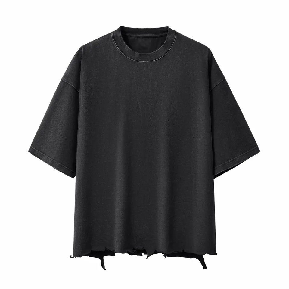 เสื้อยืดวินเทจผู้ชายแบบย้อมสีเอซิด พิมพ์ลายโลโก้คุณภาพสูงแบบ DTG ผ้าฝ้าย 100% ทรงไหล่ตก สีซีดแบบซันเฟด สโนว์วอช