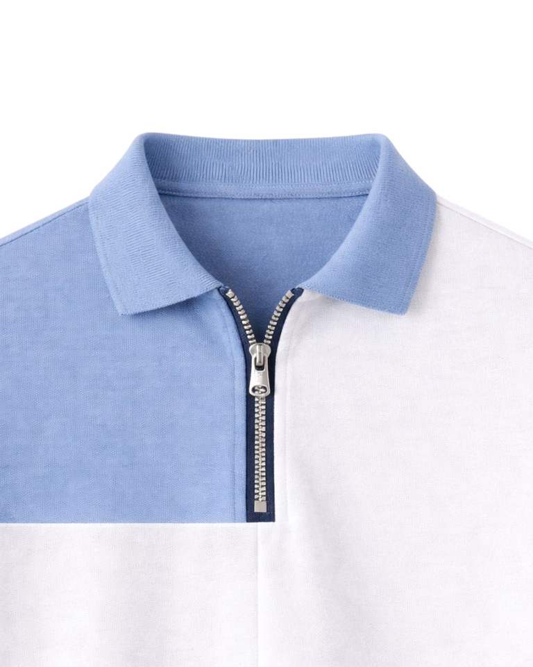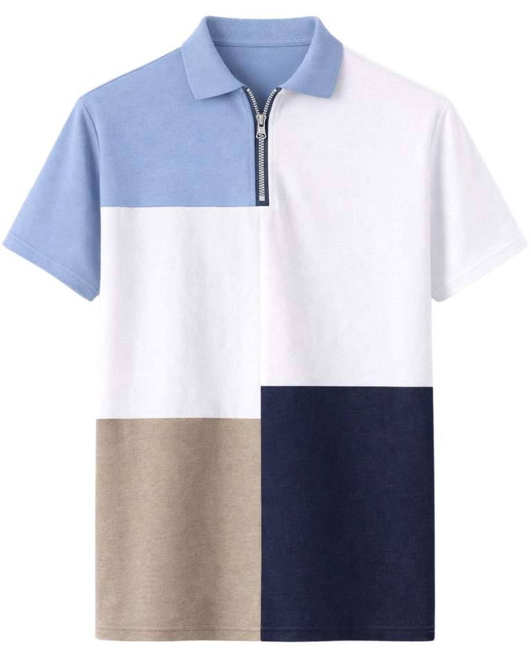 ผู้ผลิตเสื้อโปโลชายแบบซิปครึ่งตัว สีฟ้า ขาว เบจ กรมท่า คัลเลอร์บล็อก แขนสั้น เสื้อลำลอง สั่งผลิตได้ตามแบบ OEM