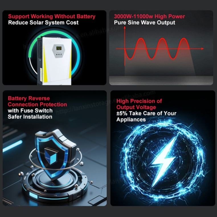 อินเวอร์เตอร์พลังงานแสงอาทิตย์ในร่มสำหรับ3.6KW เครื่องแปลงไฮเดอร์ไฮบริดแบบคลื่นไซน์บริสุทธิ์ MPPT 11KW ไฮบริด