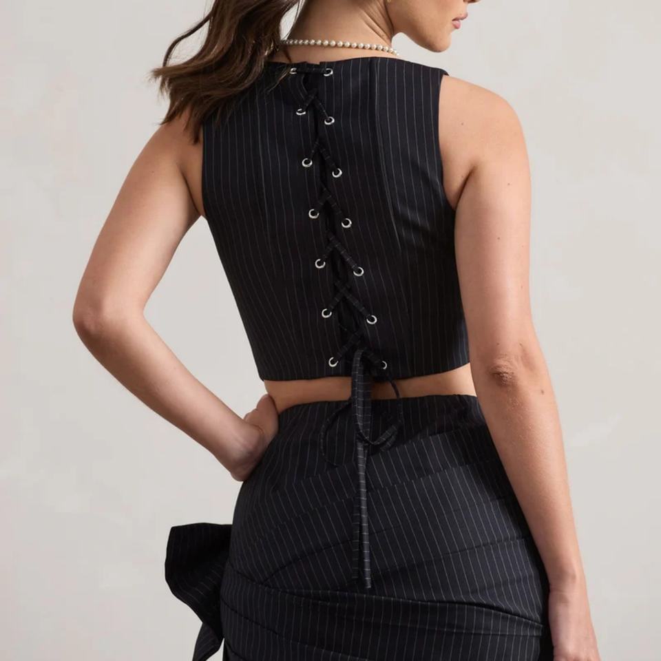 ชุดเซ็ต 2 ชิ้นสำหรับผู้หญิง เสื้อครอปท็อปผูกเชือกหลังลายทาง กระโปรงสั้นทรงมินิผูกโบว์ด้านข้าง