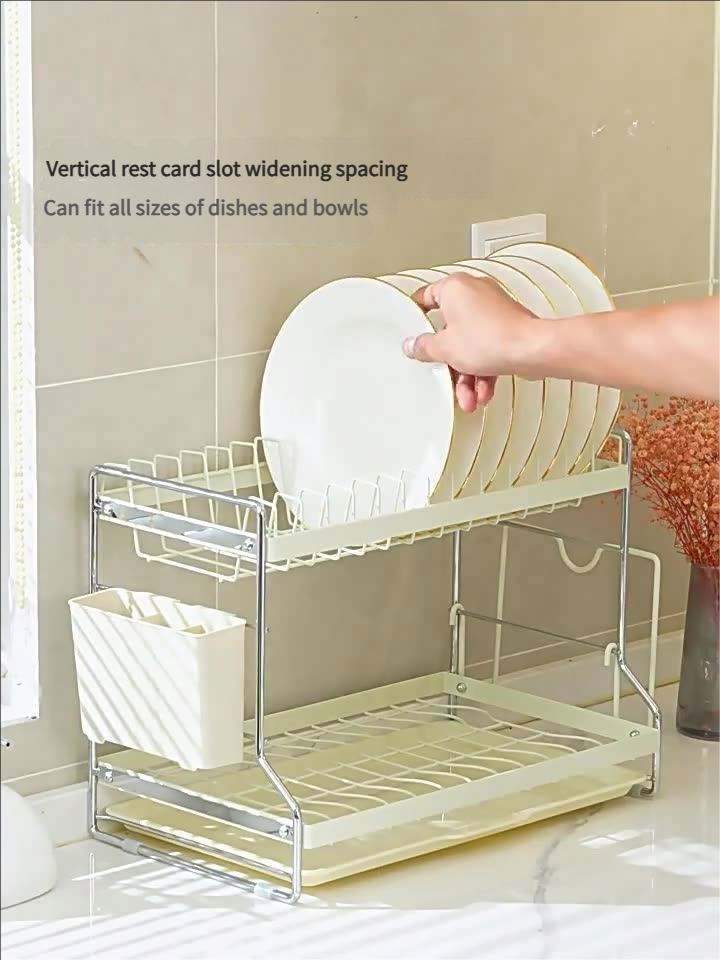 ชั้นวางจานและตะแกรงระบายน้ำติดผนังสแตนเลสสองชั้นแบบไม่พับได้ สำหรับห้องครัว อุปกรณ์จัดเก็บของใช้ในบ้านทันสมัย