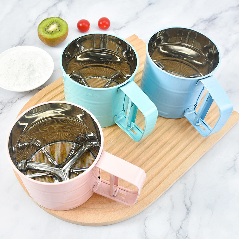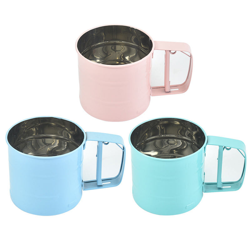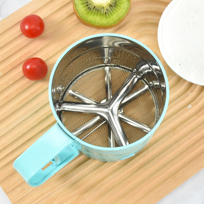 เครื่องร่อนแป้งแบบกึ่งอัตโนมัติ ยี่ห้อ Universea รุ่น MFS-7 สีชมพูเขียว ผลิตจากสแตนเลส ใช้แรงกดมือ สำหรับร่อนแป้ง น้ำตาลไอซิ่ง และวัตถุดิบอบขนม