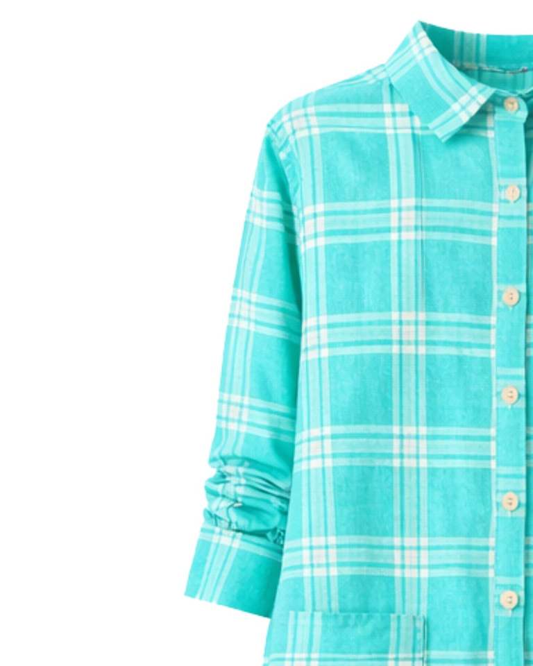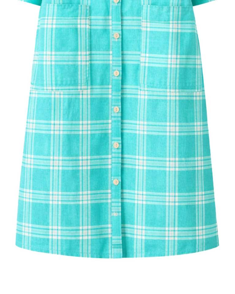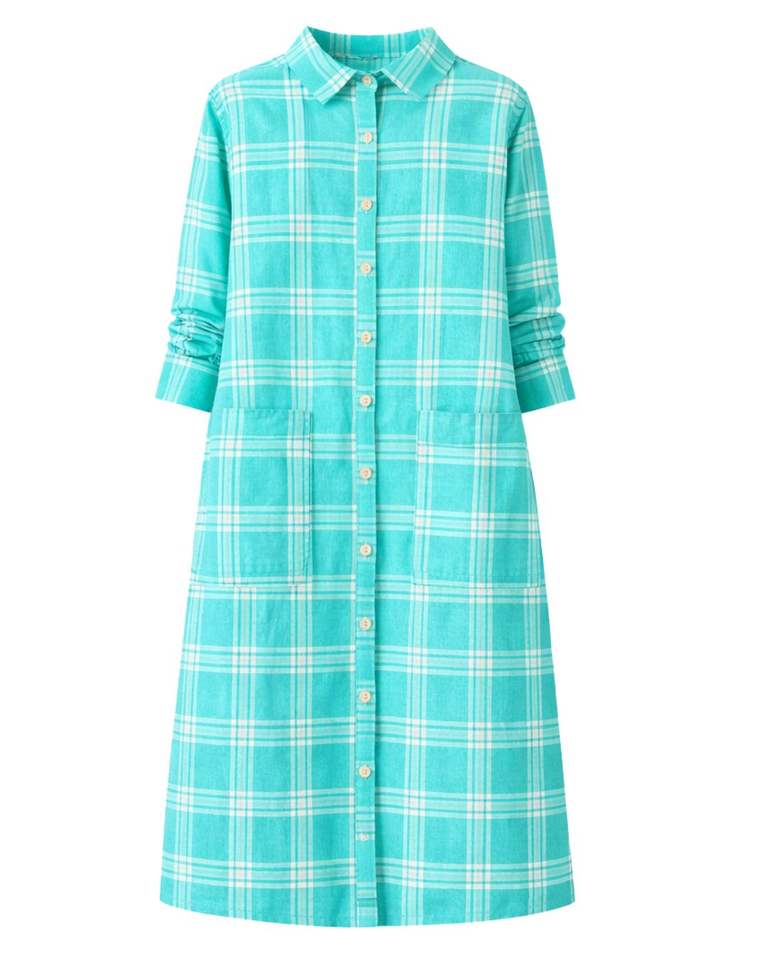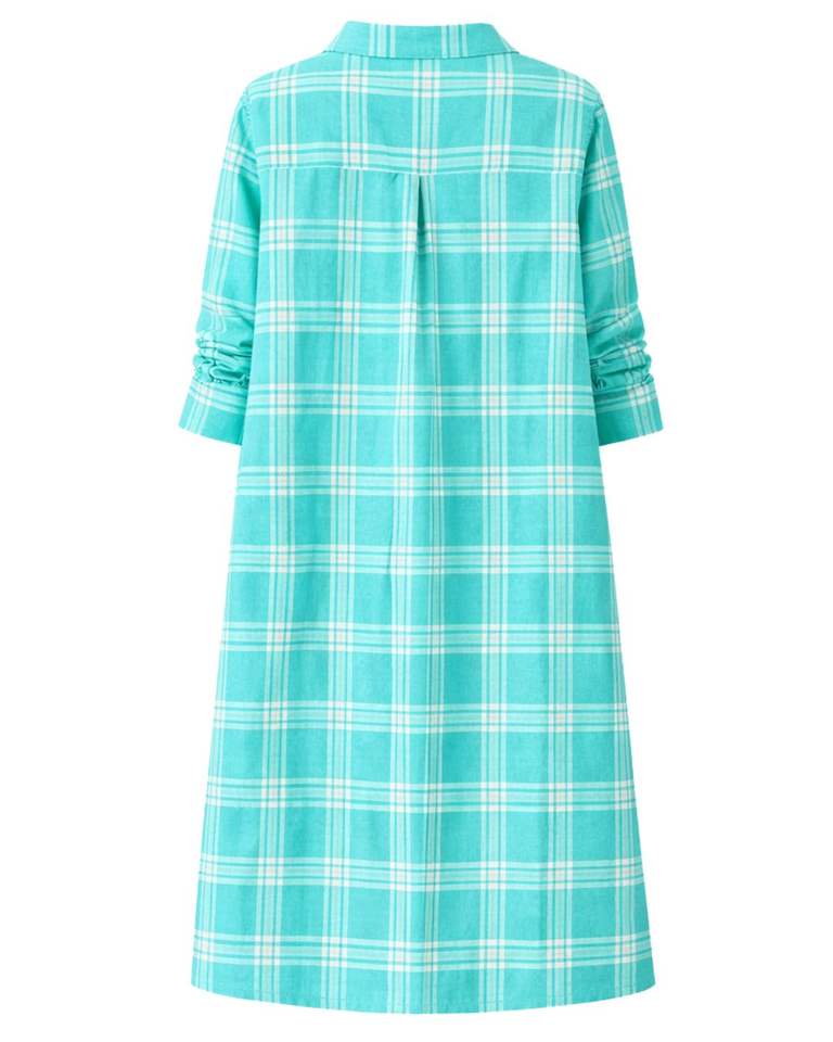 ชุดเดรสยาวลายสก็อตสีเทอร์ควอยซ์สำหรับผู้หญิง ติดกระดุม แขนยาว สไตล์ลำลอง ความยาวปานกลาง รับผลิตตามสั่ง ขายส่ง