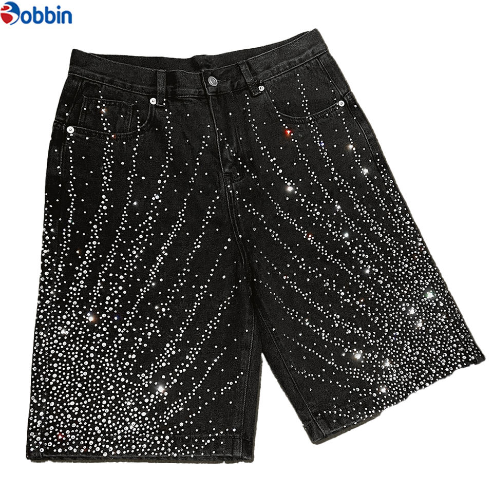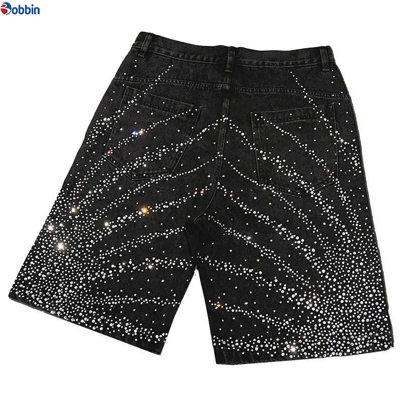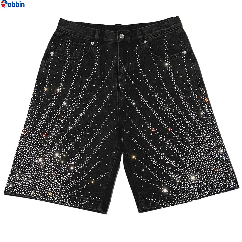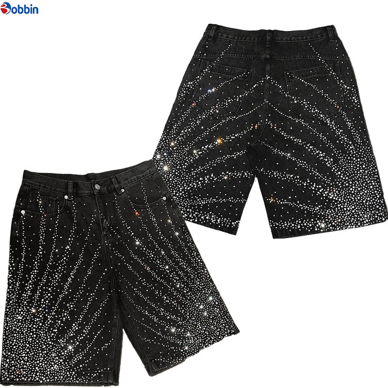 กางเกงยีนส์ขาสั้นทรงโอเวอร์ไซส์สไตล์วินเทจสำหรับผู้ชาย แบรนด์ Manufacturer ตกแต่งด้วยโลโก้แบบกำหนดเองและคริสตัล ดีไซน์สุดฮิต กางเกงยีนส์ขาสั้นทรงหลวมสำหรับผู้ชาย