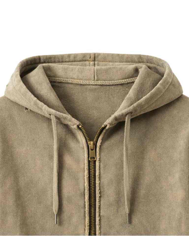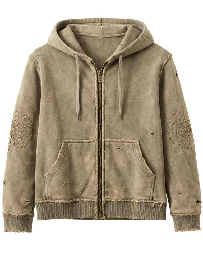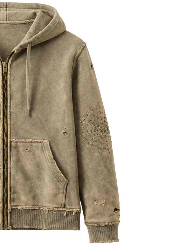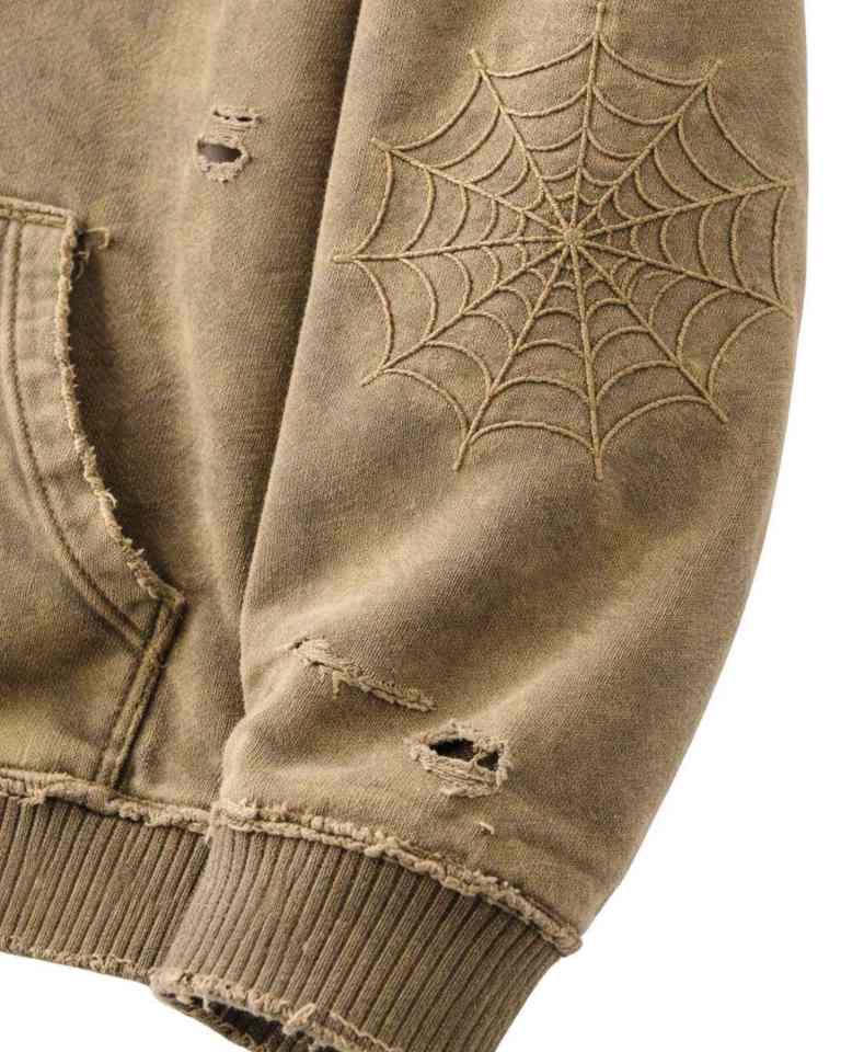 เสื้อฮู้ดซิปสีกากีแบบวินเทจ ยี่ห้อ Manufacturer ตกแต่งลายปักใยแมงมุม สไตล์สตรีทแวร์