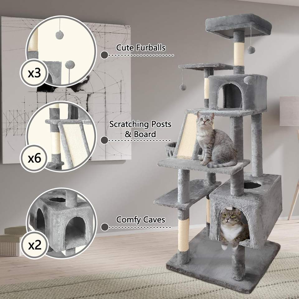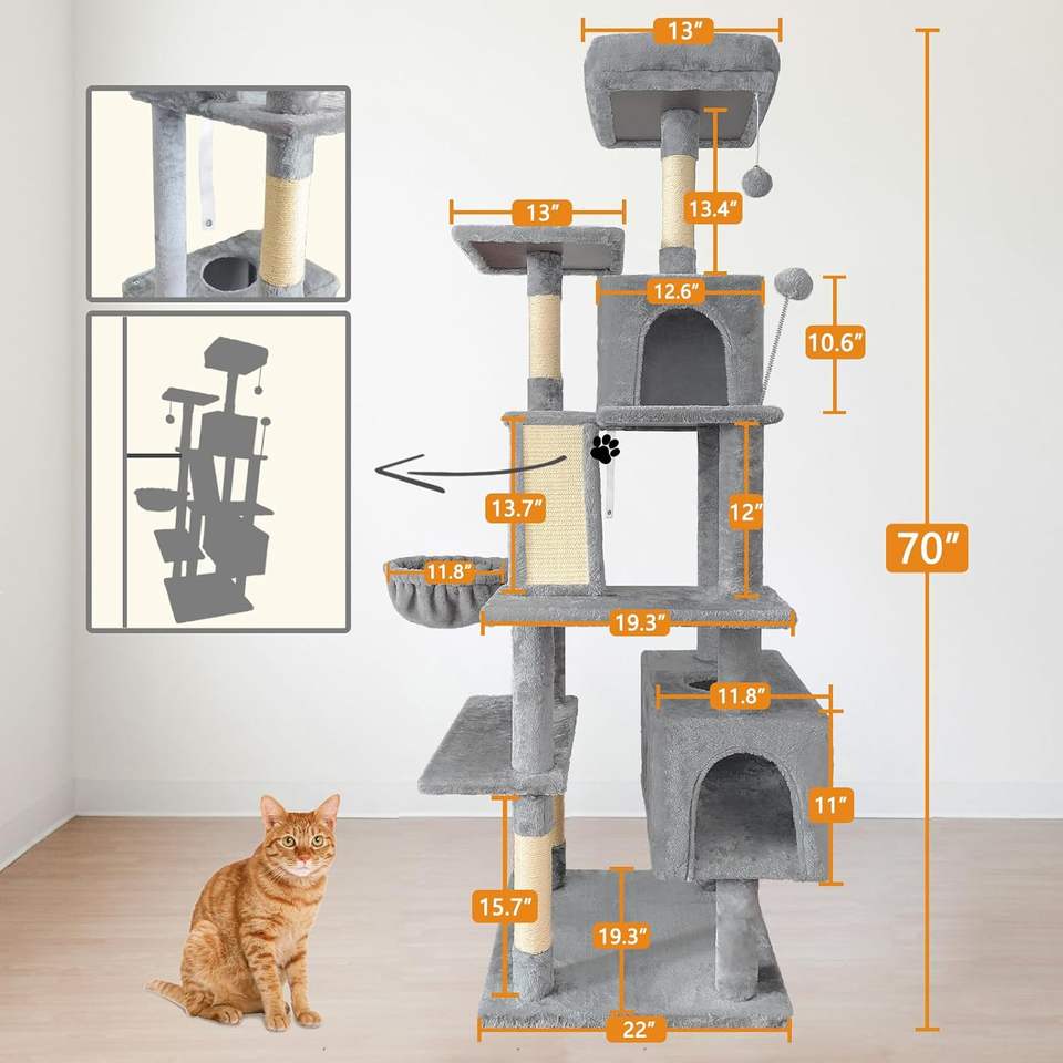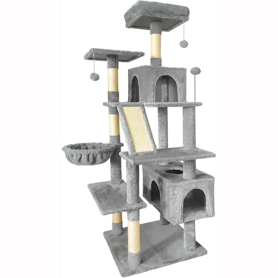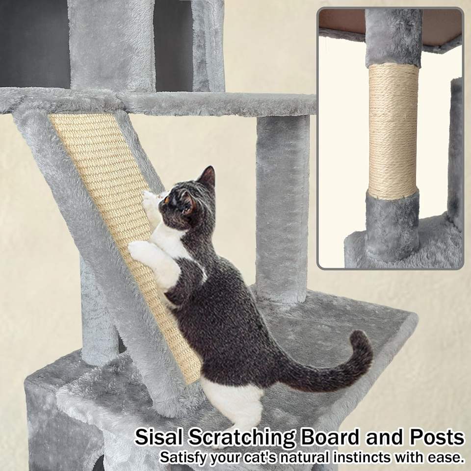 หอคอยต้นไม้แมวที่เกาผ้ากำมะหยี่สีเบจสีเทาป่านศรนารายณ์พร้อมบันได