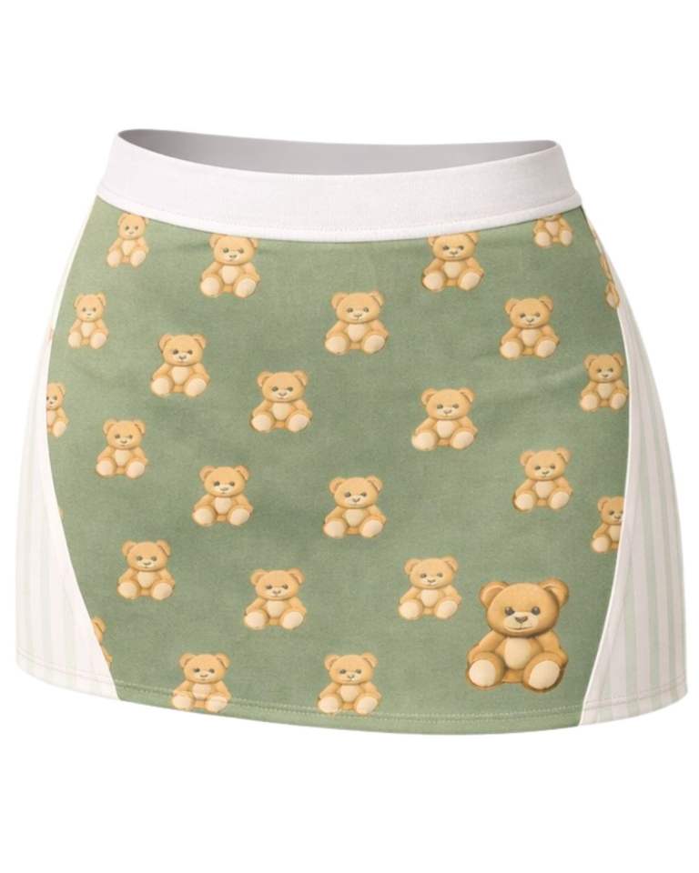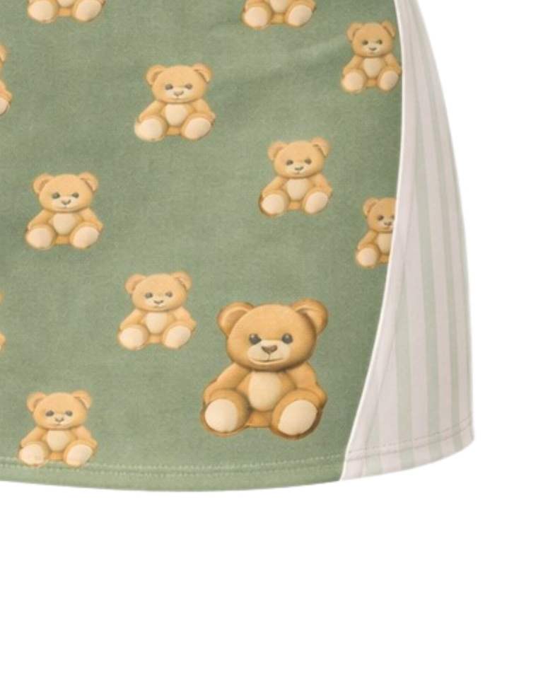 ชุดเซ็ตกระโปรงสองชิ้นสีเขียวเซจสำหรับผู้หญิง ลายพิมพ์หมีเท็ดดี้ เสื้อครอปแขนกุด กระโปรงมินิเอวสูง เนื้อผ้านุ่มยืดหยุ่น