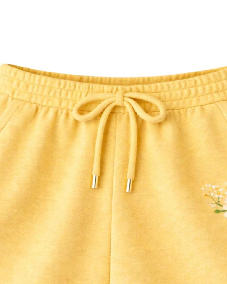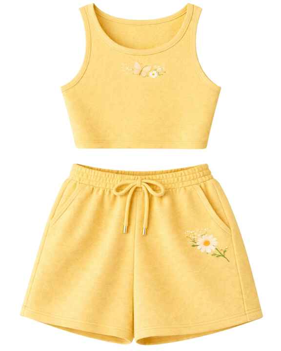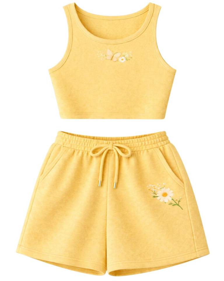 ชุดเซ็ตสองชิ้น เสื้อครอปแขนกุดสีเหลืองลายริบบิ้นสำหรับผู้หญิง และกางเกงขาสั้น ลายดอกไม้ ชุดลำลองฤดูร้อน สั่งทำได้
