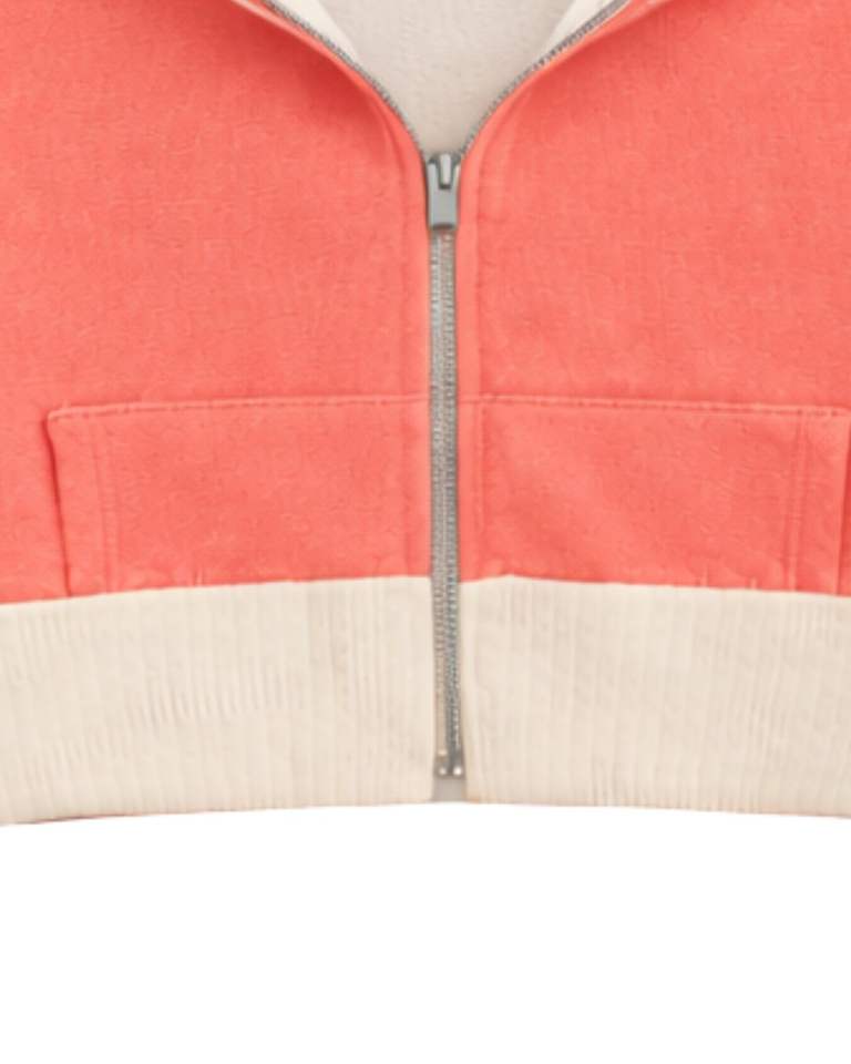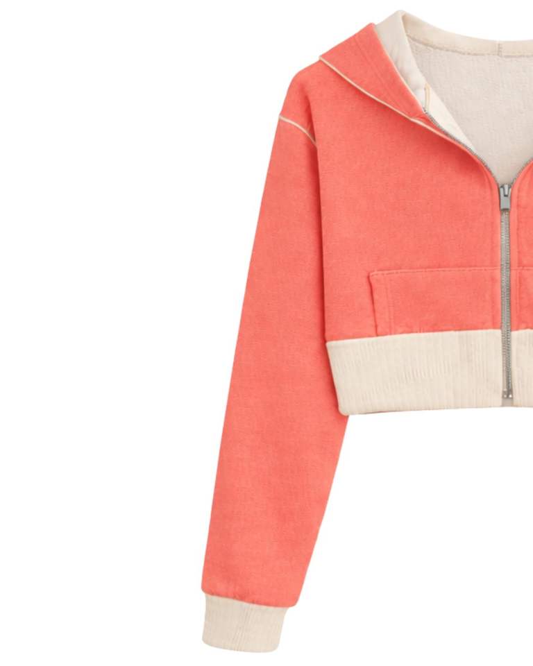 เสื้อฮู้ดครอปซิปสำหรับผู้หญิง สีชมพูคอรัล ผ้าฝ้ายฟลีซ แต่งสีบล็อก สไตล์ลำลอง สตรีทแวร์