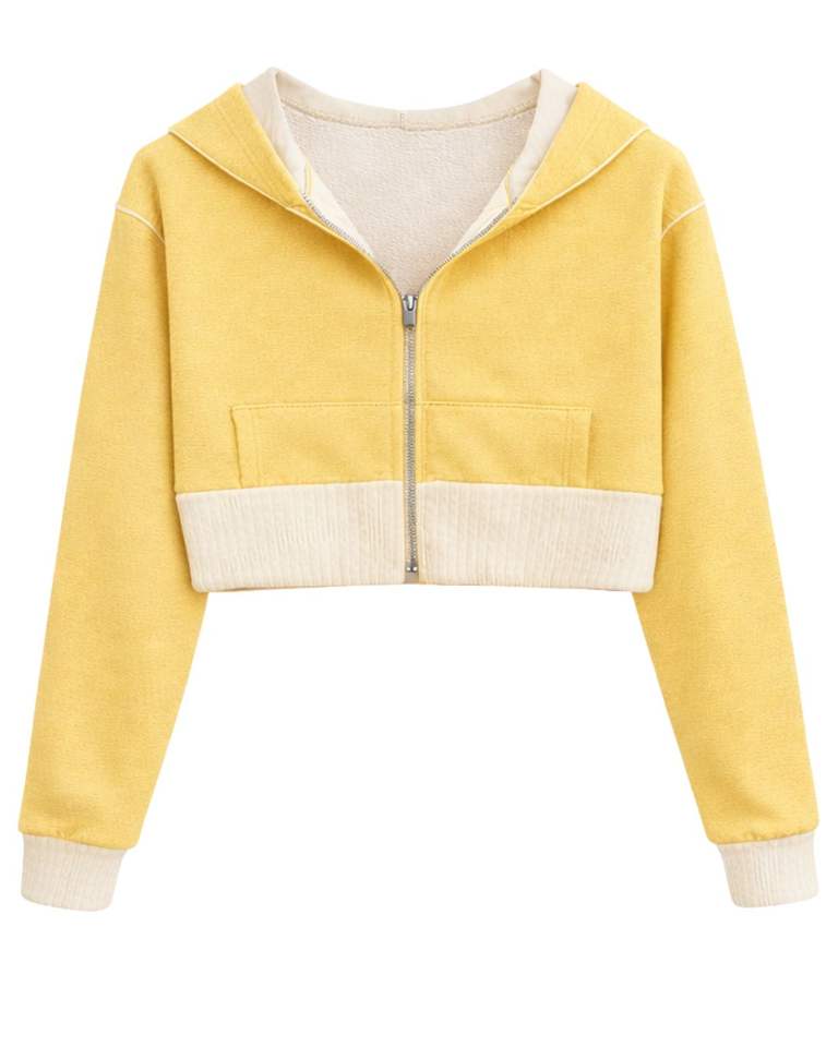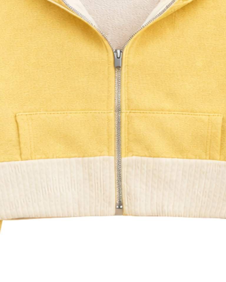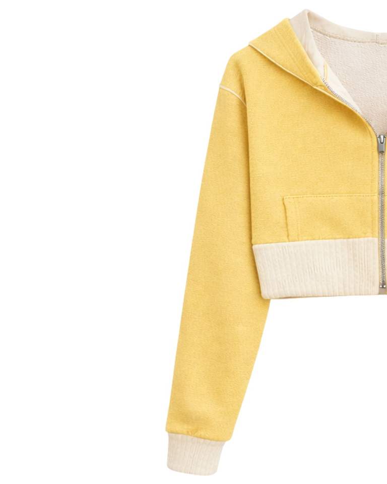 เสื้อฮู้ดครอปซิปสำหรับผู้หญิง สีเหลืองพาสเทล ผ้าฝ้ายฟลีซ แต่งสีบล็อก สไตล์ลำลอง สตรีทแวร์