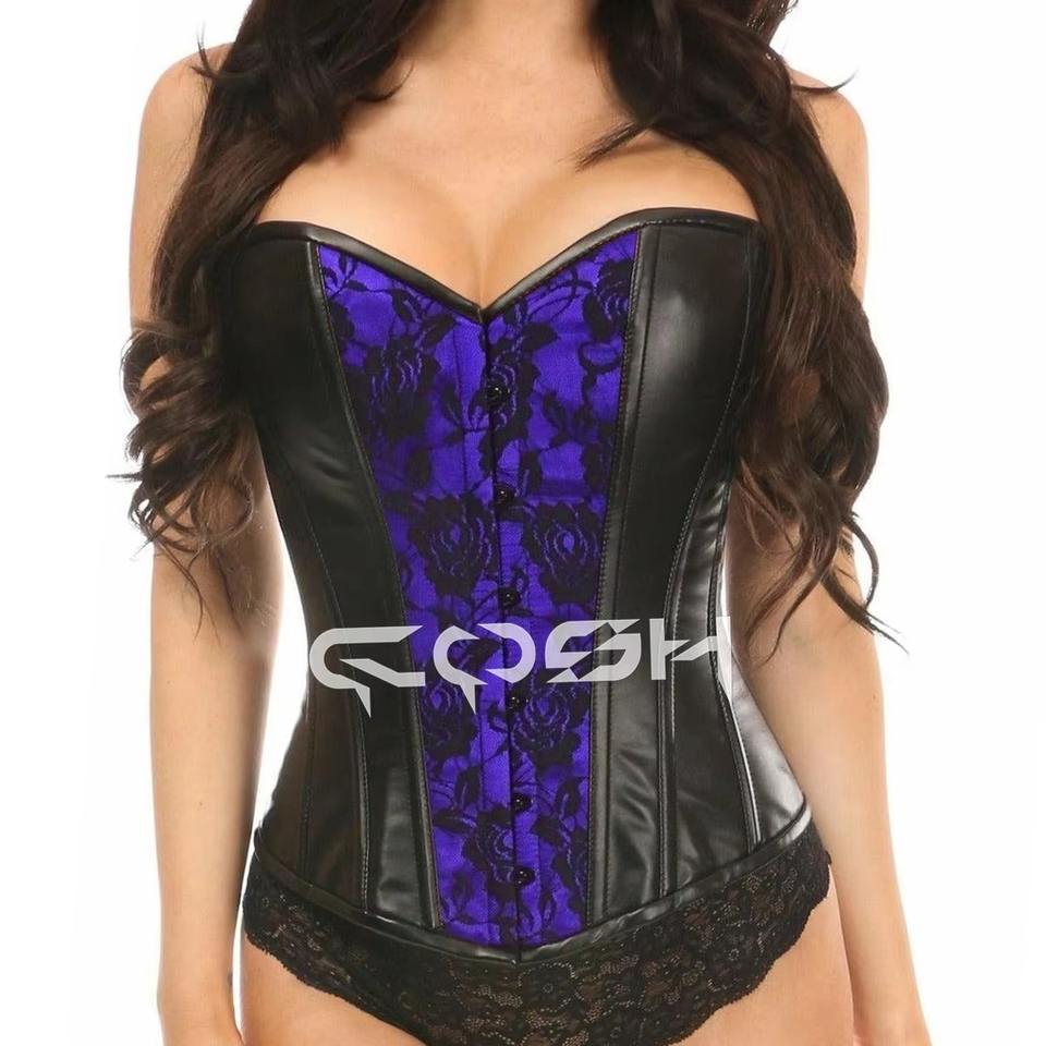 ผู้ผลิตชุดคอร์เซ็ทแต่งงานแบบโอเวอร์บัสท์หนังสีดำ แต่งผ้าซาตินสีแดงด้านหน้า พร้อมลูกไม้ปัก