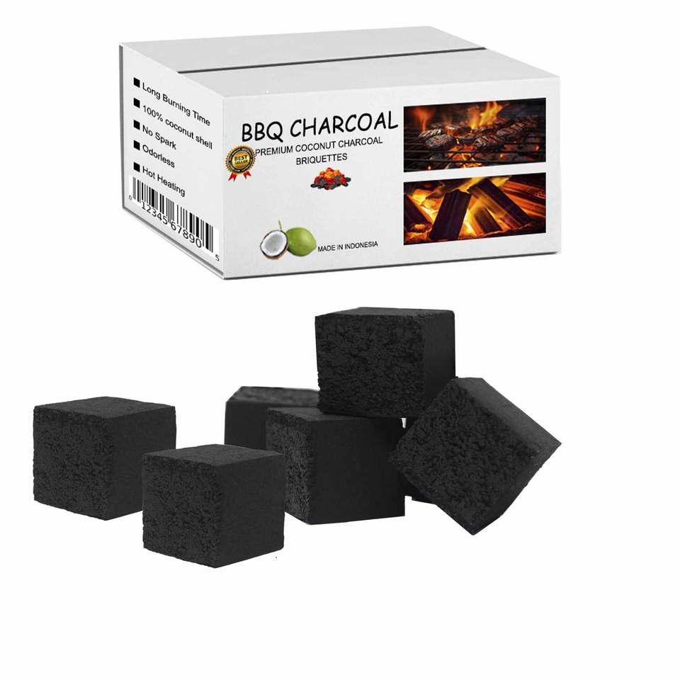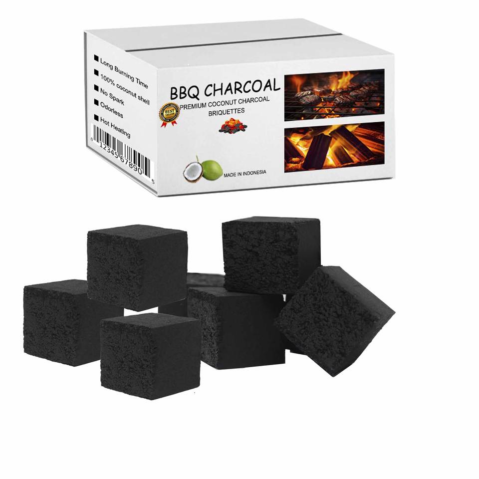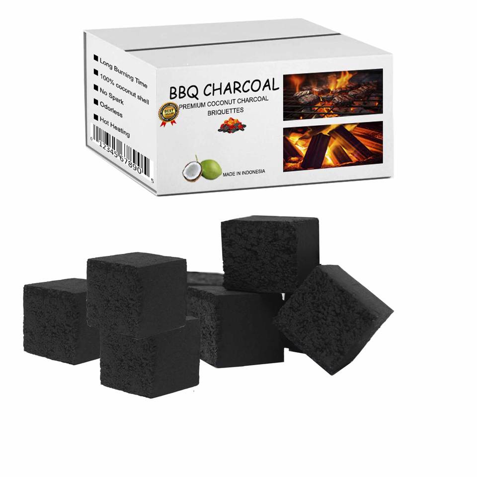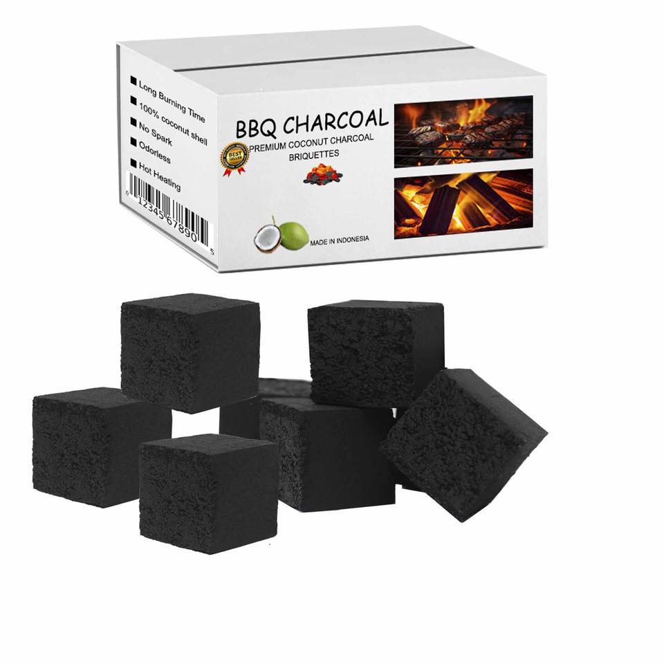 กะลามะพร้าวย่างถ่านสีดำ10กก. ทรงลูกบาศก์แบบไร้ควันกะลามะพร้าวธรรมชาติสร้างความร้อนได้สูงสำหรับยุโรปผู้ผลิตกลางแจ้ง