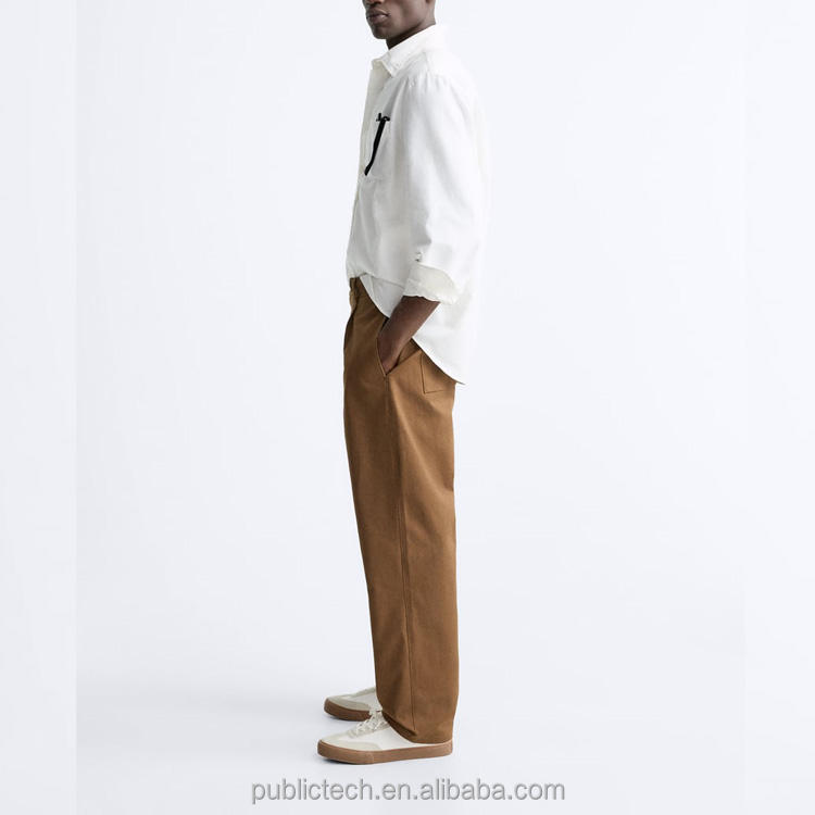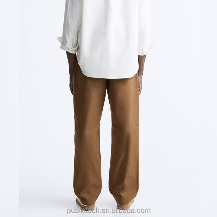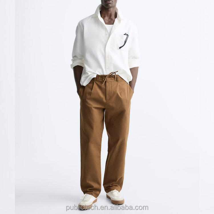 กางเกงชิโนสีน้ำตาลพร้อมเชือกรูดสำหรับผู้ชายกางเกงลำลองขาบานแบบลำลองขายาว