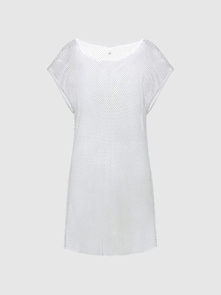 เดรสสั้นผ้าตาข่ายสีขาวเซ็กซี่สำหรับผู้หญิงมินิเดรสผ่าไหล่น้ำหนักเบาผ้าตาข่ายแห้งเร็วเซ็กซี่