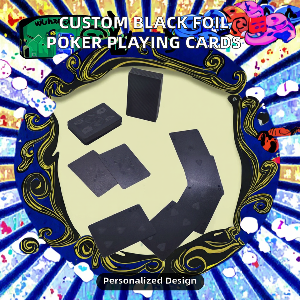 ผลิตการ์ดเล่นพลาสติกเคลือบฟอยล์สีดำแบบกำหนดเองสำหรับโฆษณาและของขวัญ พร้อมพิมพ์ลายสีทองและสีเงิน