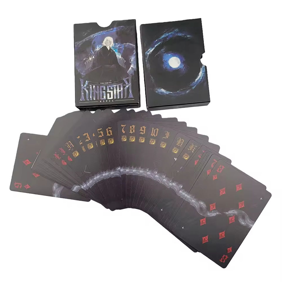 ผลิตการ์ดเล่นพลาสติกเคลือบฟอยล์สีดำแบบกำหนดเองสำหรับโฆษณาและของขวัญ พร้อมพิมพ์ลายสีทองและสีเงิน