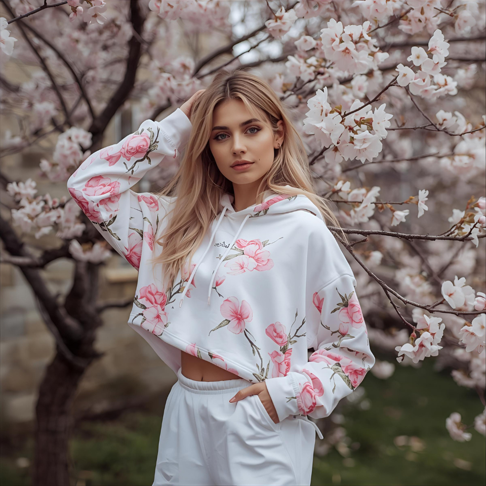 เสื้อมีฮู้ดพิมพ์ลายเชอร์รี่ bloosem สำหรับผู้หญิง | ผู้ผลิตเครื่องแต่งกายแนวสตรีทดีไซน์ลายดอกไม้ตามสั่ง