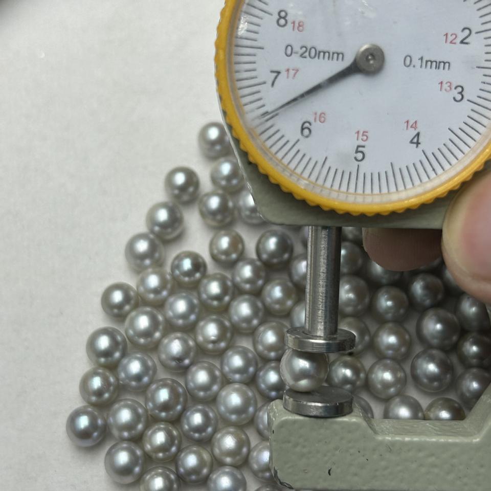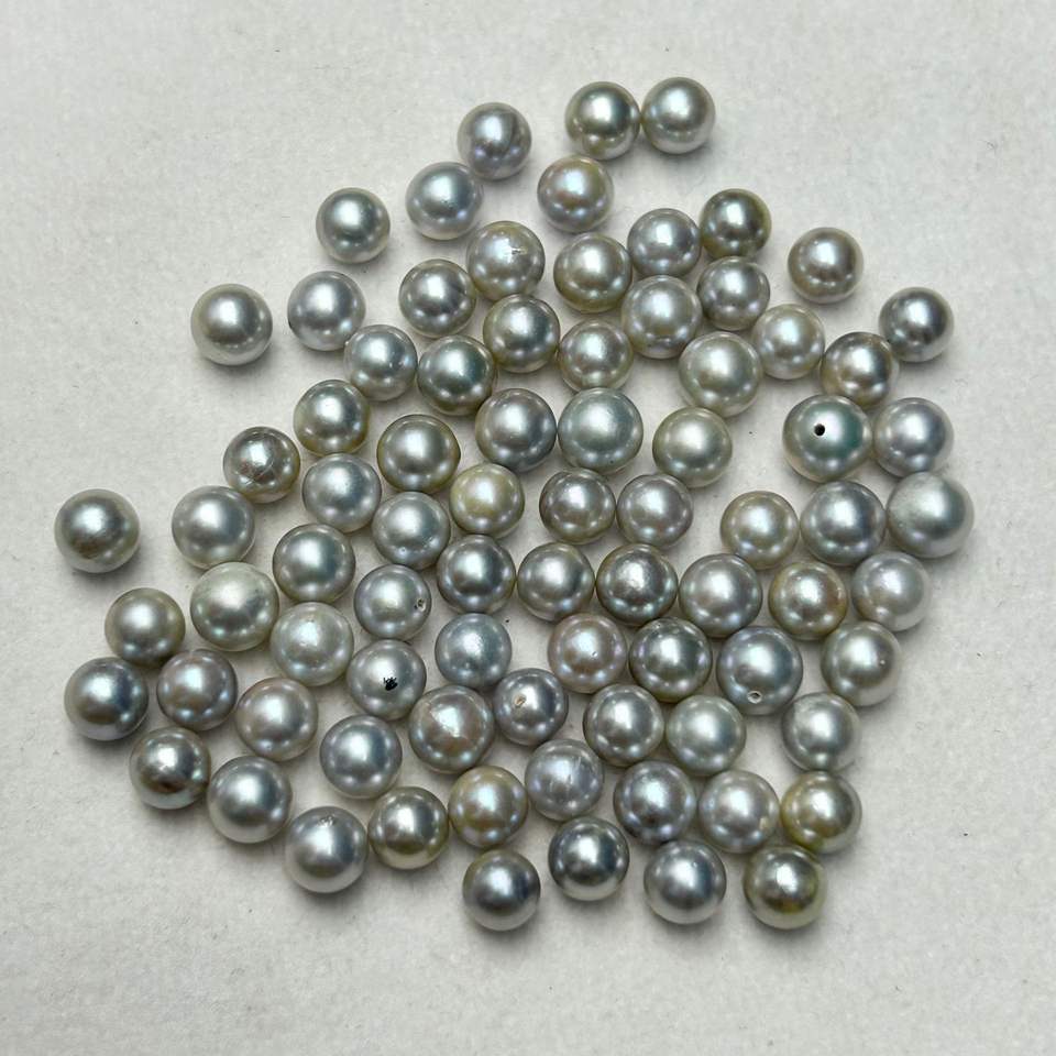 ไข่มุกอะโกย่าจากน้ำทะเล ขนาด 6-7 มม. หลายเม็ด รูปทรงกลมสมบูรณ์แบบ แสงเงางาม มีตำหนิเพียงเล็กน้อย ไข่มุกเปลือยจากจูจี้ แบบธรรมชาติ