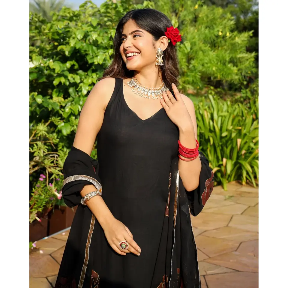 ชุดลำลองแบบชิ้นเดียวของ Manya Lady สีดำ ผ้าถักลายเพ้นท์มือ กางเกงขายาวทรงกว้าง เสื้อทรงเข้ารูป คอผูกโบว์ สำหรับใส่ไปออฟฟิศ คลับ ฤดูใบไม้ร่วง