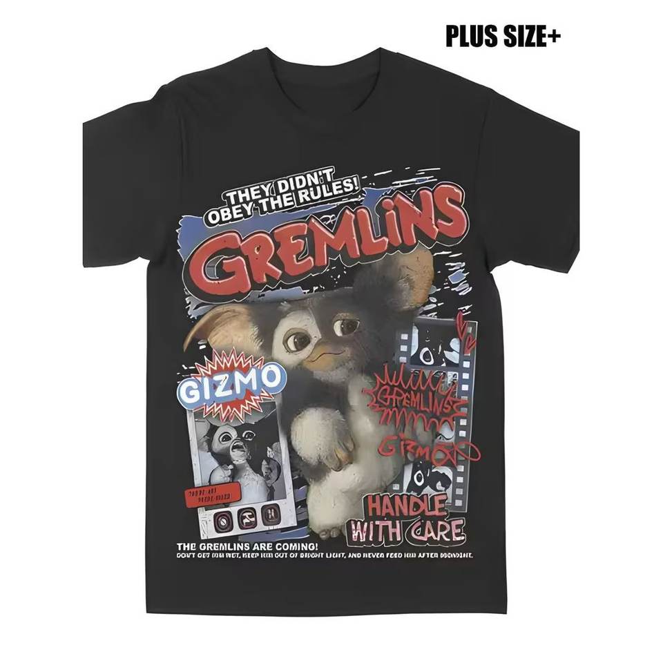 เสื้อยืดลำลองผู้ชาย Manya Qianchuan ไซส์ S-XXXL ผ้าคอตตอนหนา 180GSM พิมพ์ลายกราฟิก Gremlins สีดำ ทรงหลวม รุ่นจีน