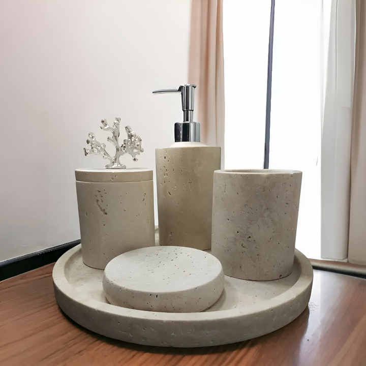 ชุดห้องน้ำหินอ่อน Travertine ชุดห้องน้ำระดับพรีเมี่ยมถาดโต๊ะเครื่องแป้งและอุปกรณ์เสริมสำหรับห้องน้ำในบ้านและอุปกรณ์โรงแรม