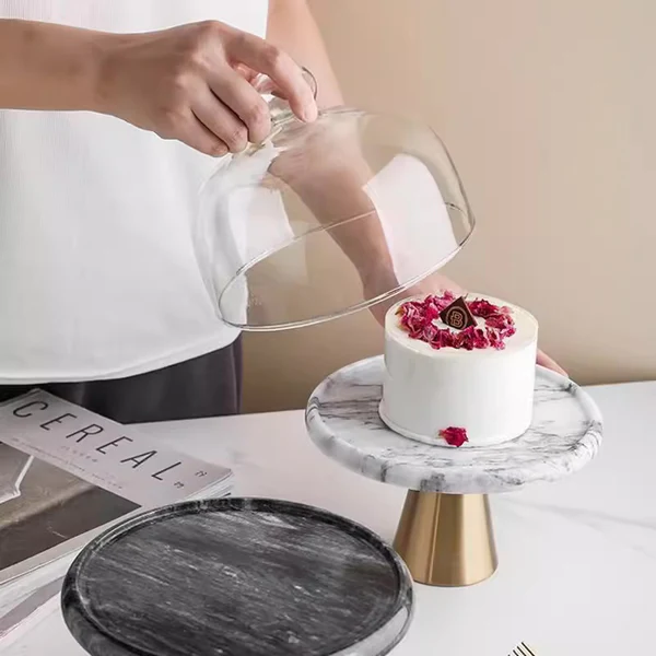 ที่ตั้งเค้กหินอ่อนฐานรองทองเหลืองหินสีเทางานฝีมือสมัยใหม่ใช้สำหรับงานแต่งงานงานปาร์ตี้