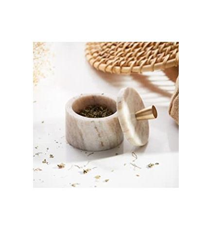 ชามพริกไทยและเกลือหินอ่อนพร้อมช้อนทองเหลืองเครื่องมือห้องครัวหินสีเทาและเครื่องใช้ชามพริกไทยหินอ่อน