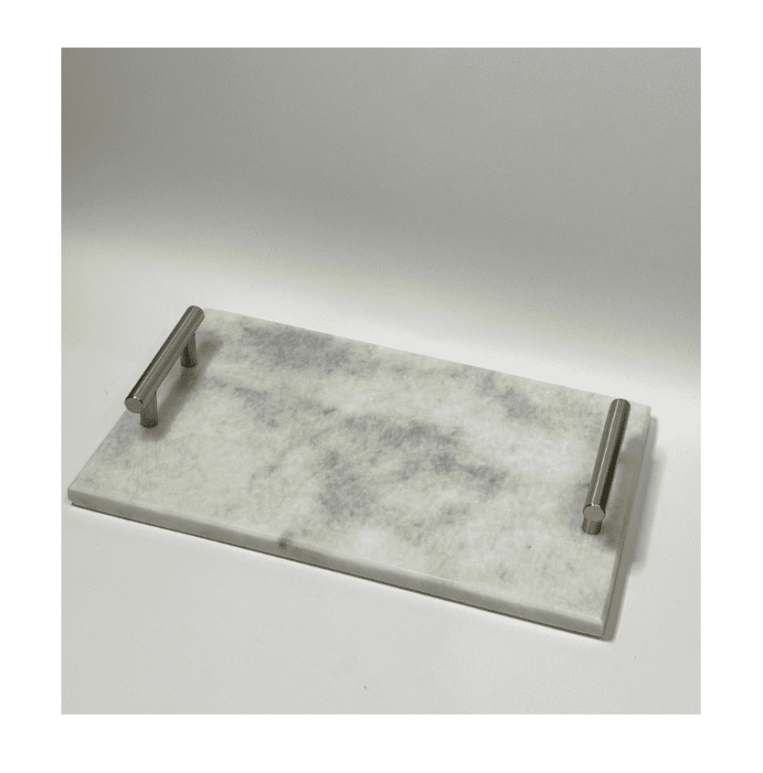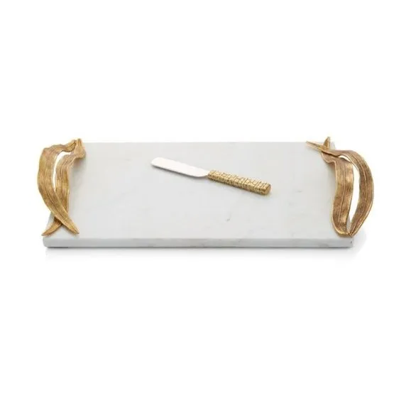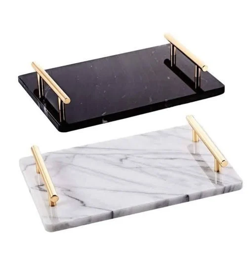 ถาดเสิร์ฟหินอ่อนถาดหินอ่อนหินสีขาวด้ามจับทรงใบไม้ทองเหลือง
