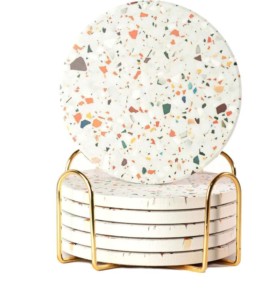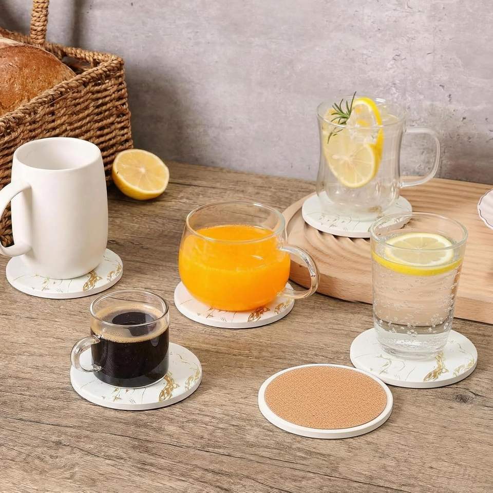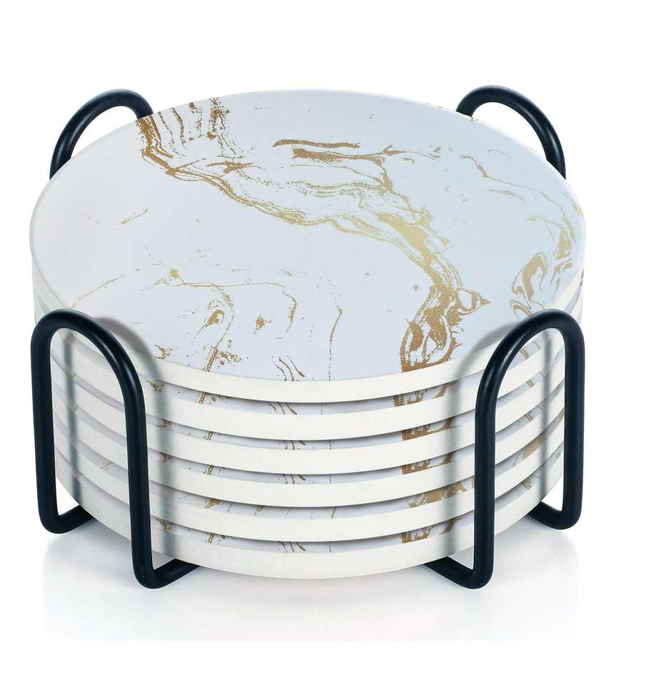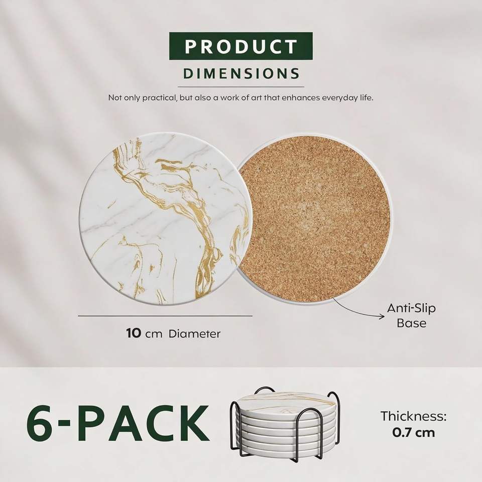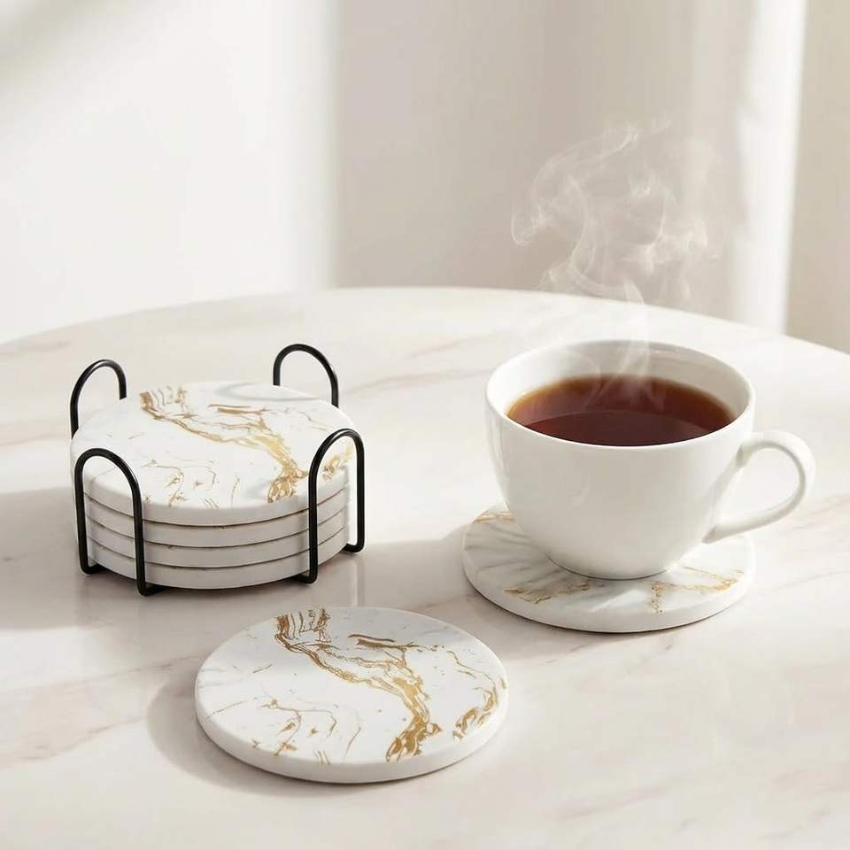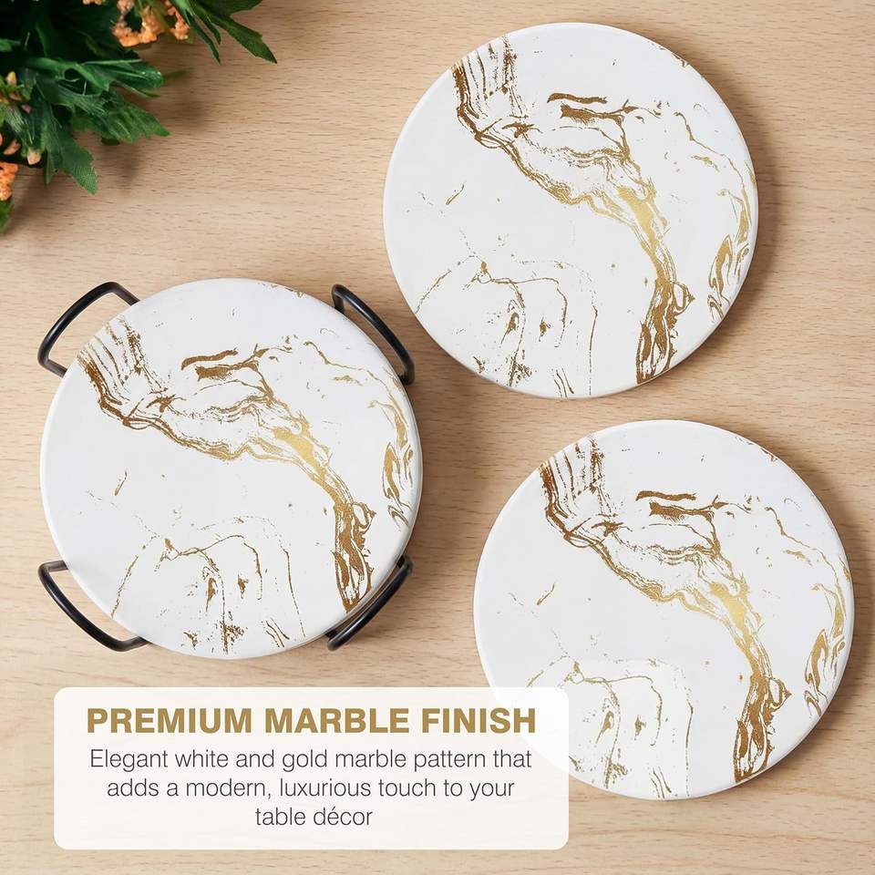 แผ่นรองแก้วเซรามิคลายหินอ่อนพร้อมที่วางโลหะ สำหรับชา กาแฟ และโต๊ะอาหาร ทนความร้อน ใช้ได้ทั้งที่บ้านและที่ทำงาน