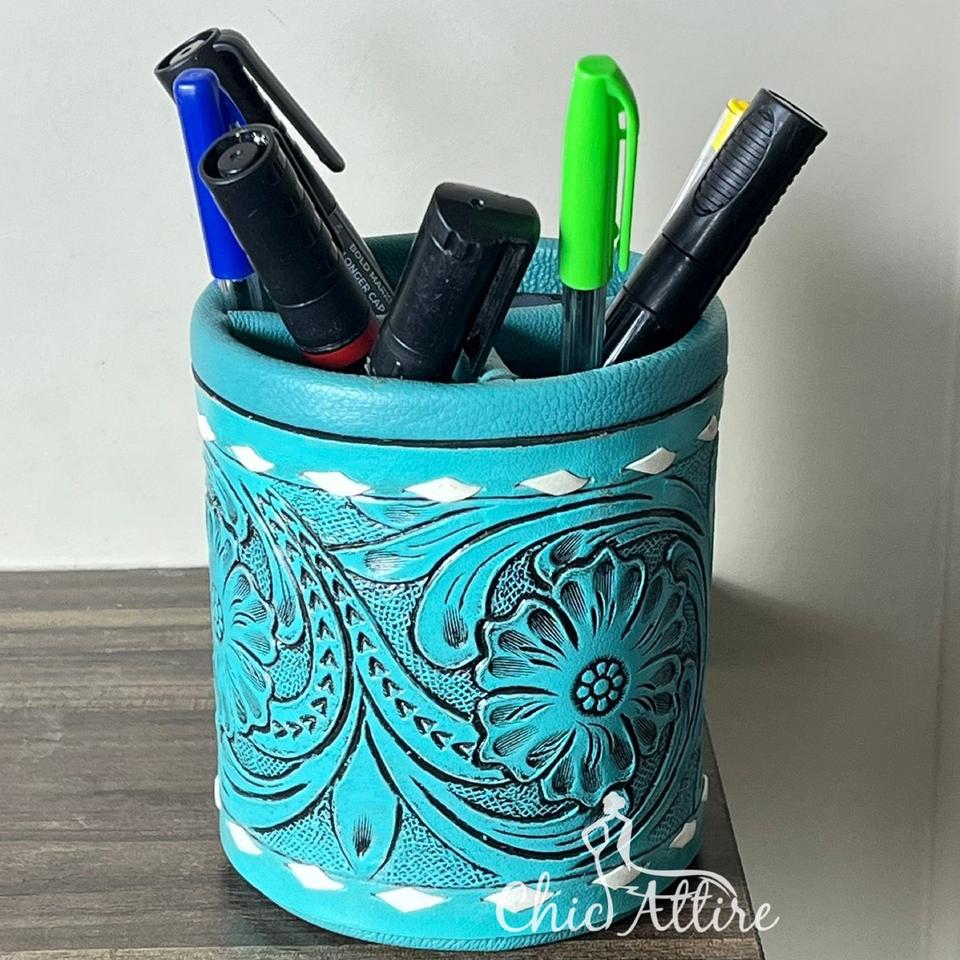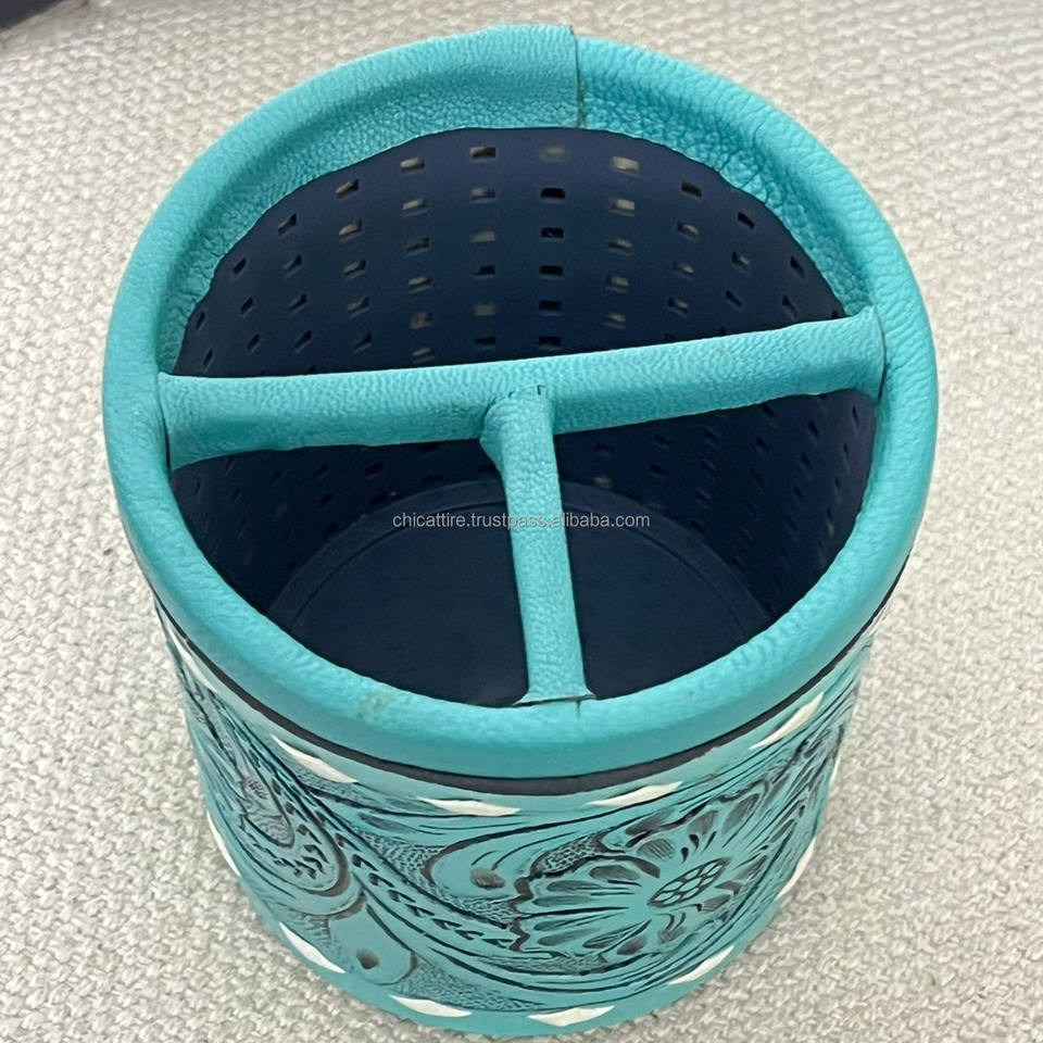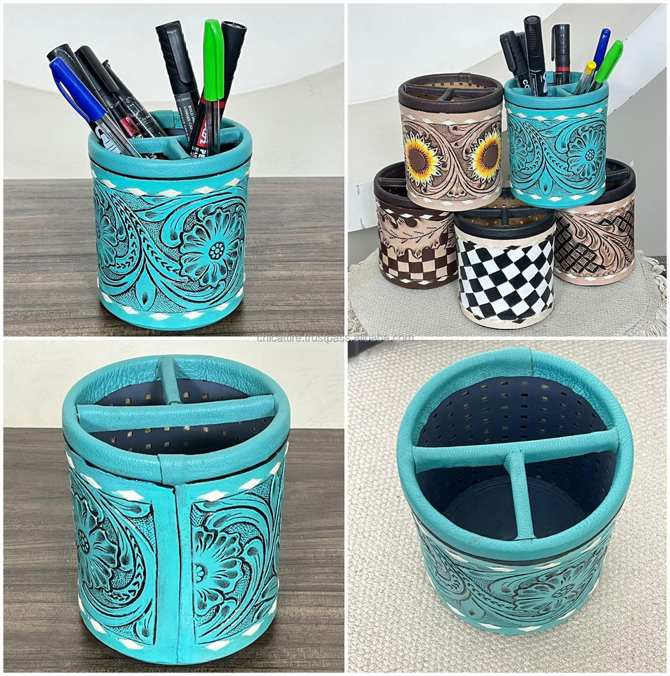 ตะกร้าใส่แปรงแต่งหน้าหนังวัวแท้สลักลายโลโก้ตามสั่งสำหรับงาน March Expo แบบพกพา ใช้เป็นที่ใส่ปากกาสำนักงาน ที่วางปากกาตั้งโต๊ะ ที่จัดระเบียบปากกาและดินสอ