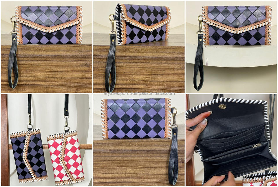 กระเป๋าสตางค์หนังวัวแท้ลายตารางหมากรุกสีดำและสีม่วงสไตล์วินเทจสำหรับผู้หญิง รุ่น March Expo ขนาดใหญ่ พร้อมสายคล้องมือ