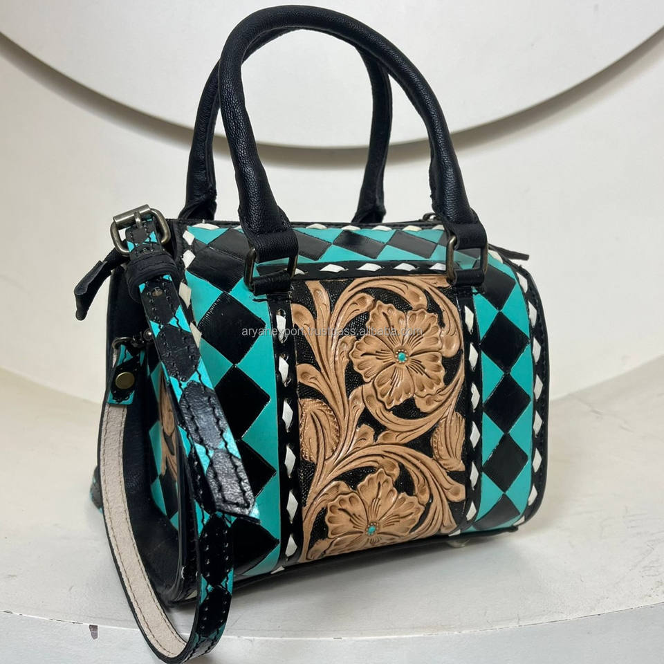 กระเป๋าถือทรงกระบอกขนาดเล็ก March Expo ลายตารางหมากรุก หนังวัวแท้สไตล์ตะวันตก ตกแต่งด้วยลายฉลุ สำหรับผู้หญิง