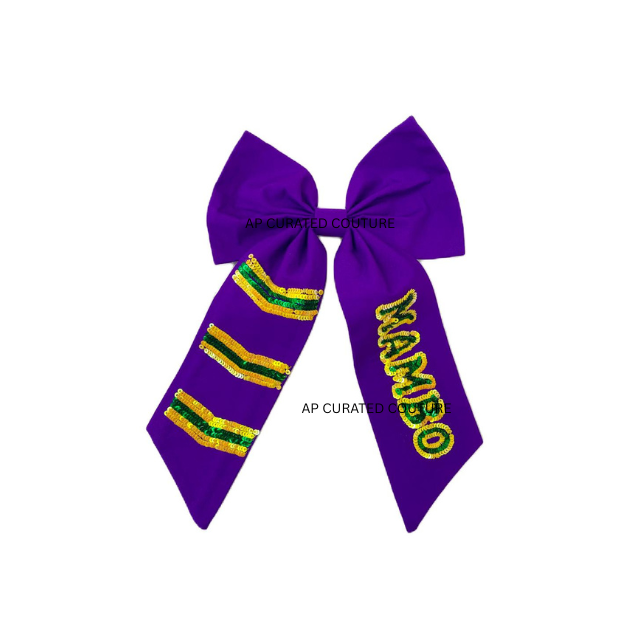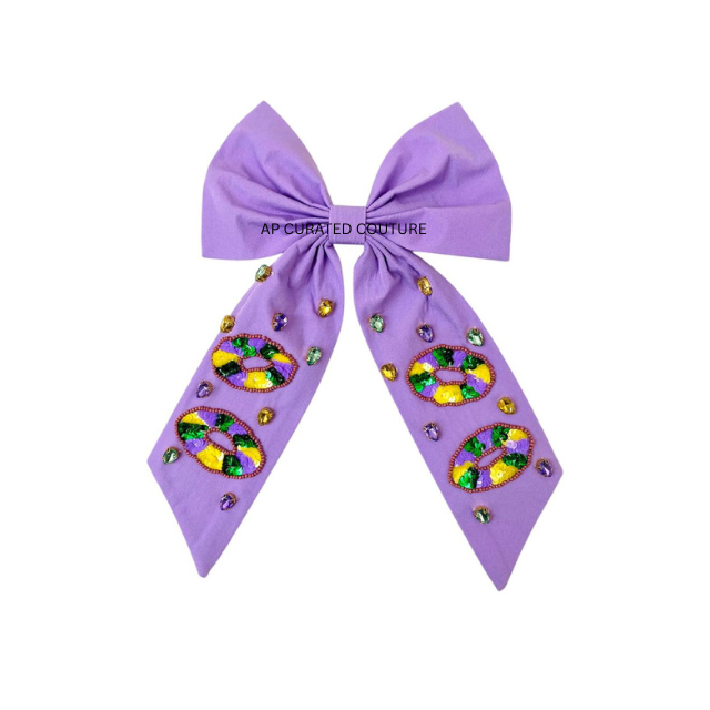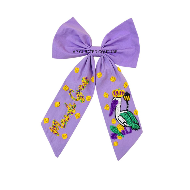 โบว์ปักลายมาร์ดิกราส์สีม่วงลาเวนเดอร์ประดับลูกปัดทำมือรูปจระเข้ คอลเลคชั่นใหม่ล่าสุดปี 2026 ประดับคริสตัลเล็ก