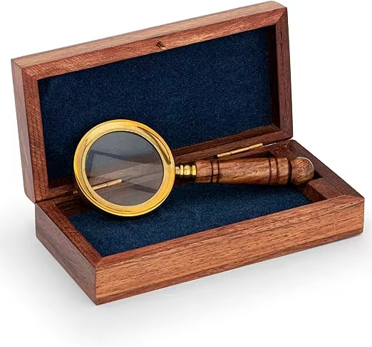 แว่นขยายขนาด11ซม. ในกล่องไม้ทำจากทองเหลืองพร้อมด้ามจับไม้