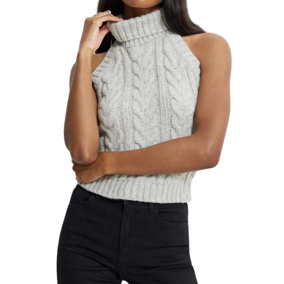 เสื้อถักไหมพรมแขนกุดทรงสั้นสีเทา Marl Grey สำหรับผู้หญิง คอเต่า ชายเสื้อเปปลัม ทรงเข้ารูป ผ้าริบ สไตล์สตรีทแฟชั่น
