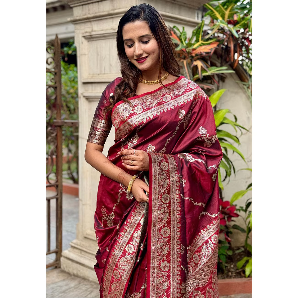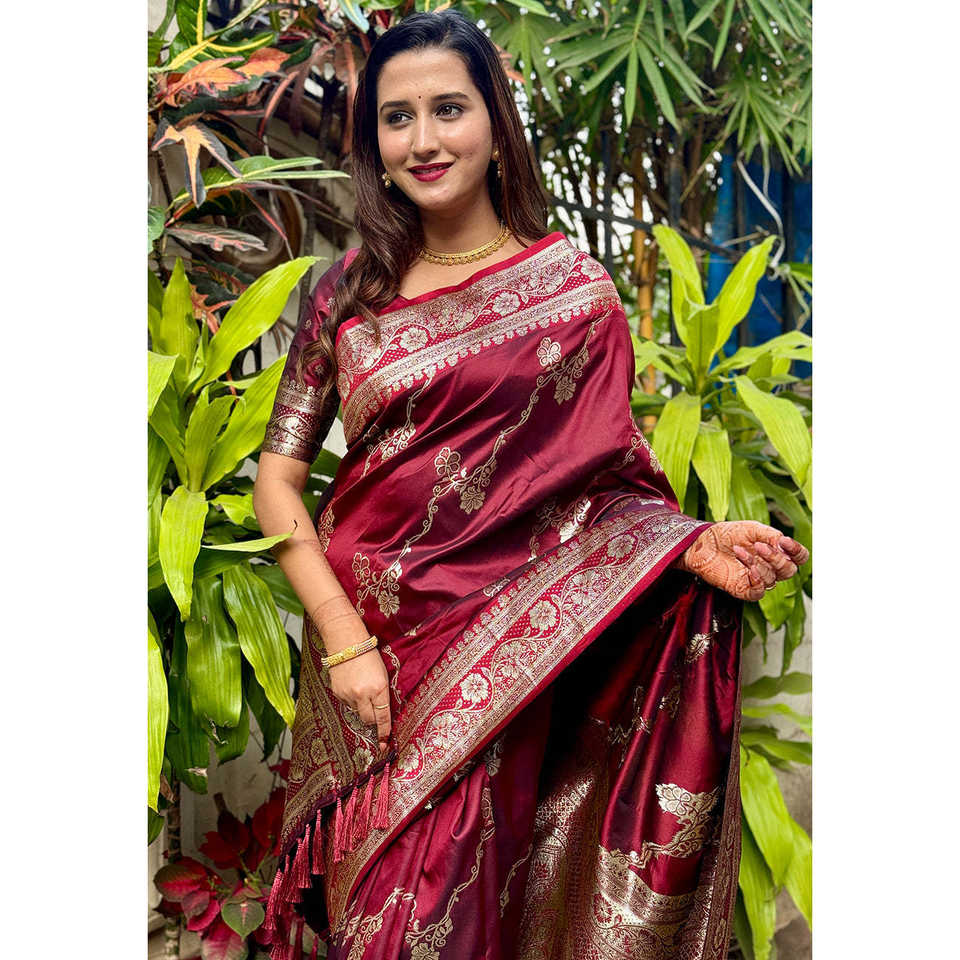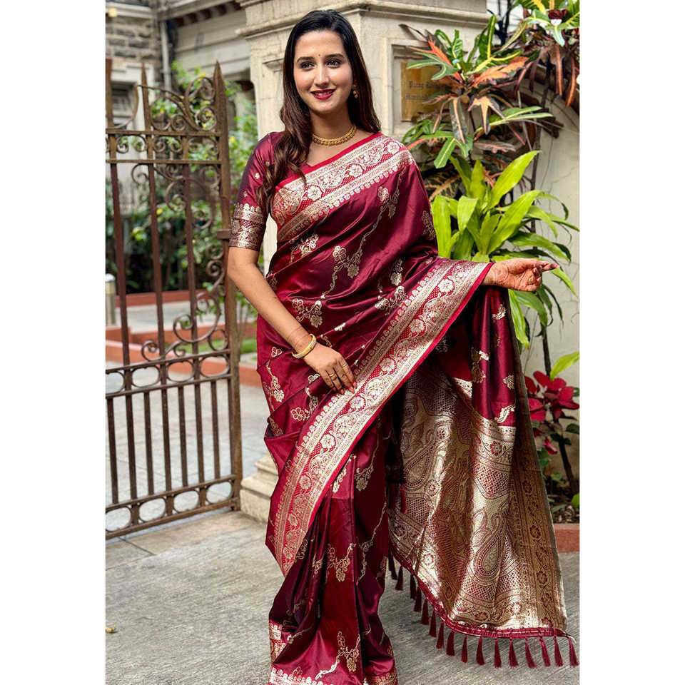 ผ้าไหมบาแนราซีสีแดงเลือดหมู ทอแบบจาล ผ้าไหมเนื้อนุ่ม ประดับด้วยดิ้นทอง ผ้าคลุมไหล่หรูหราแบบอินเดีย