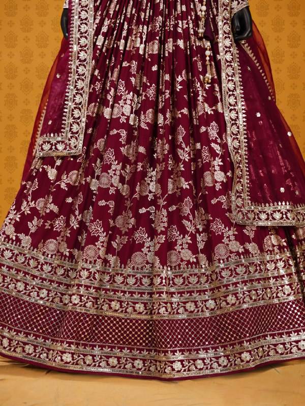 ชุดเลเฮนกาโชลีผ้าไหมแจ็คการ์ดสีมารูน ดีไซน์หรูหรา ปักลายซารีและเลื่อม พร้อมผ้าคลุมไหล่ผ้าออร์แกนซ่า เหมาะสำหรับงานปาร์ตี้สไตล์บอลลีวูด ส่งไว