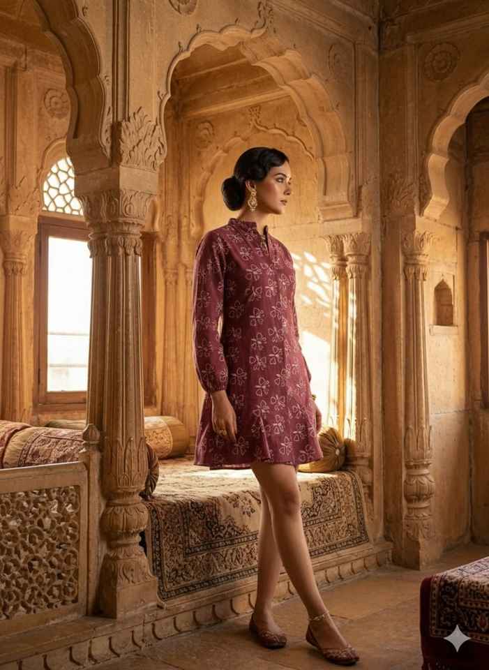 เดรสยาวปานกลางพิมพ์ลายดิจิตอลสีแดงเลือดหมู คอจีน ผ้าฝ้าย สำหรับฤดูร้อน สไตล์ชาติพันธุ์โบฮีเมียน ชุดเดรสอินเดีย งานฝีมือเก๋ไก๋ ธรรมชาติ ซักได้