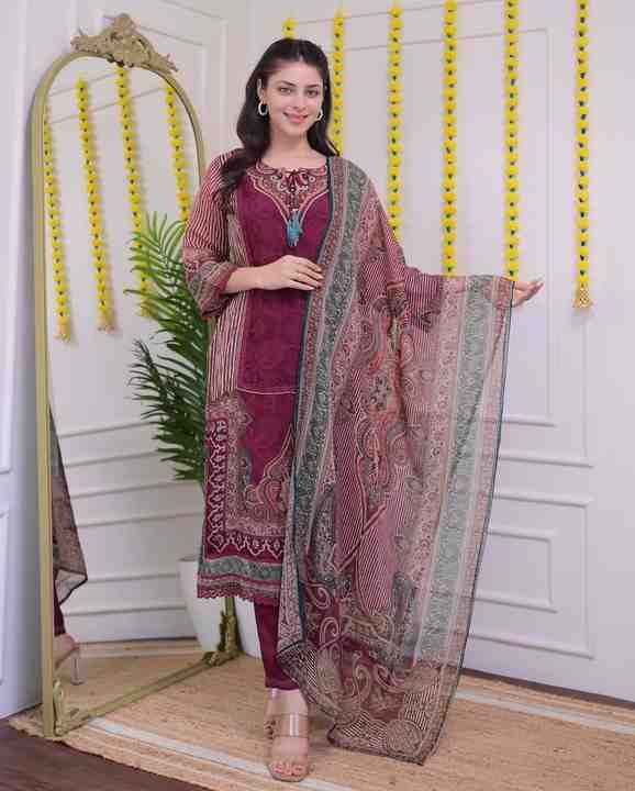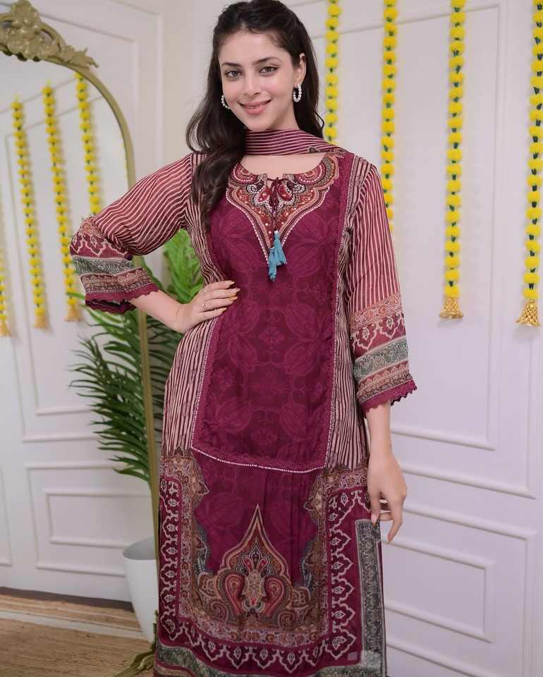 ชุดสูทผ้ามัสลินสีแดงเข้มพร้อมลายพิมพ์ดิจิตอลและปักด้วยมือผ้าฝ้ายนุ่มซับในชุดสูทมีคุณภาพดีที่สุด