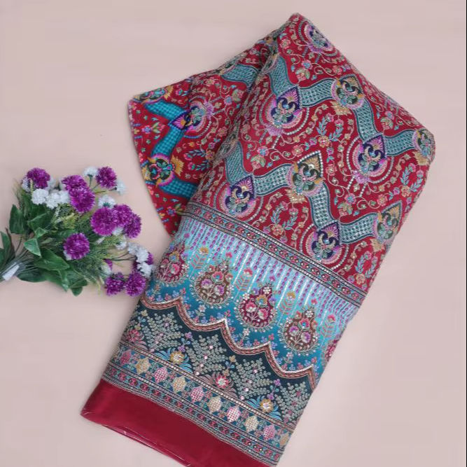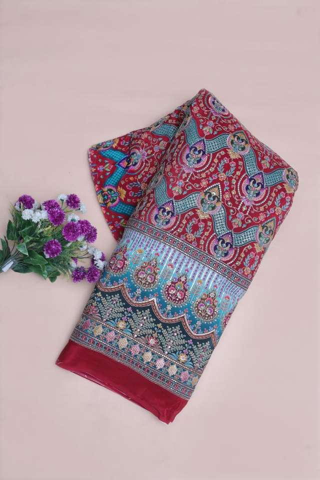 ผ้าเครปสีแดงเลือดหมูพิมพ์ลายดอกไม้และลายเรขาคณิตแบบชาติพันธุ์ พร้อมขอบตกแต่งอย่างสวยงาม เหมาะสำหรับทำชุดคุर्ติ