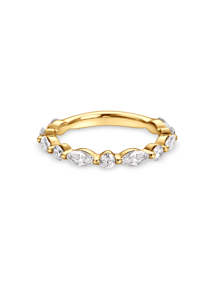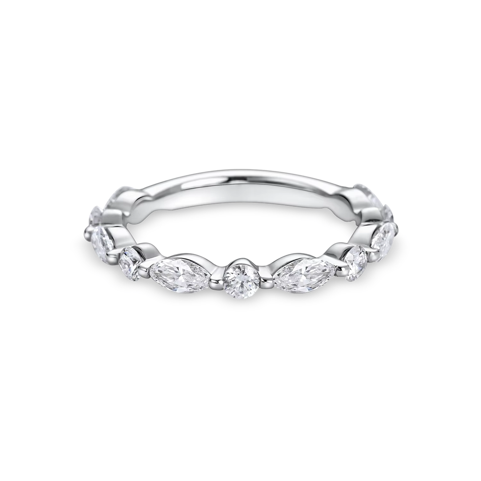 แหวนแต่งงานทรงมาร์คีส์และทรงกลมประดับเพชรแล็บโกรว์แบบครึ่งวง ทำจากทองคำขาว 18K ทองคำเหลือง 18K ทองคำโรสโกลด์ 18K และแพลตตินัม