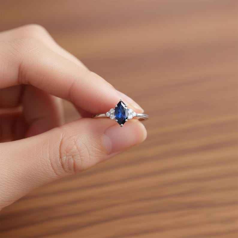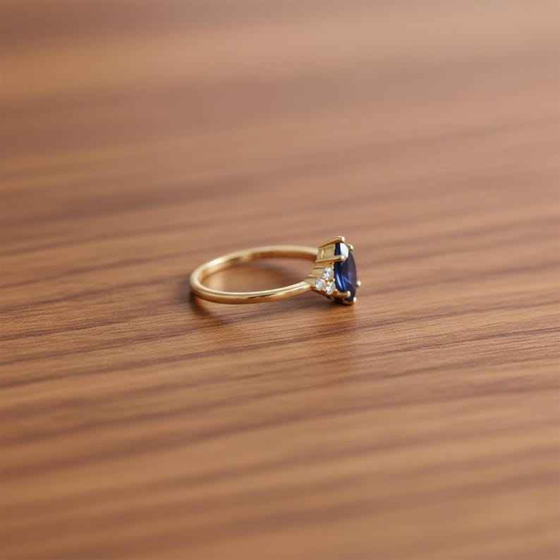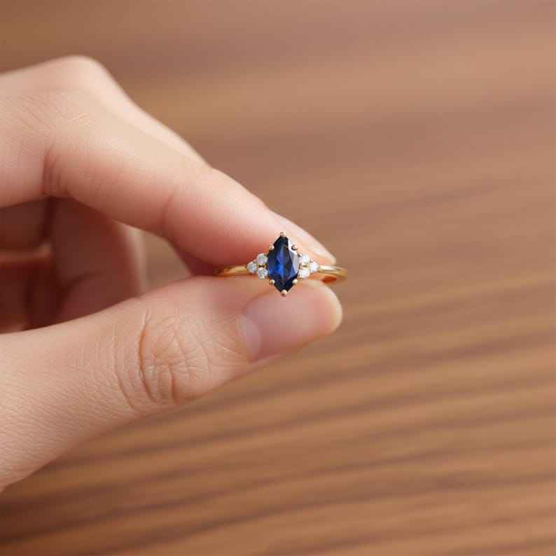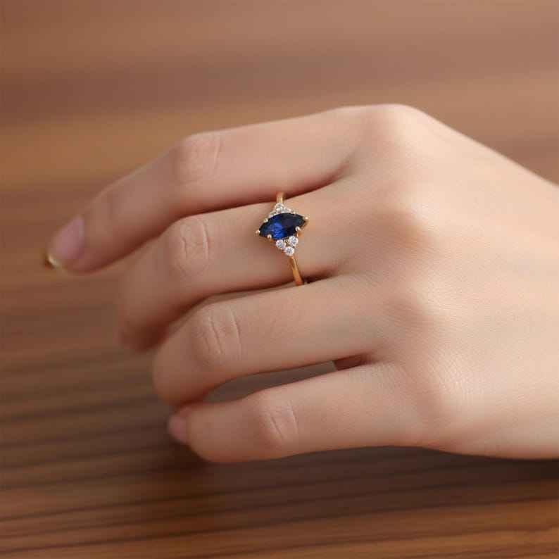 แหวนควอตซ์สีน้ำเงินมาร์คีส์ประดับเพชร CZ แหวนสัญญา เงินแท้ 925 ชุบทอง 14Kt