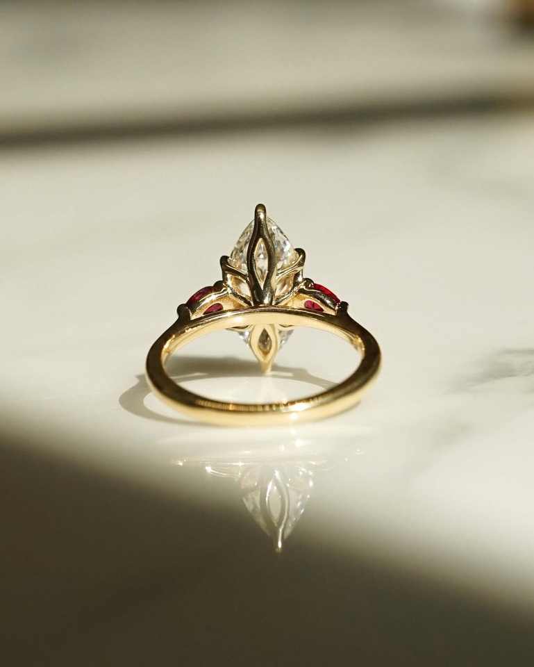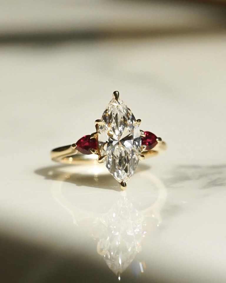 แหวนหมั้นเพชร12x6มม. ตัดเพชร18K ชุบทองหินด้านข้างสีแดง